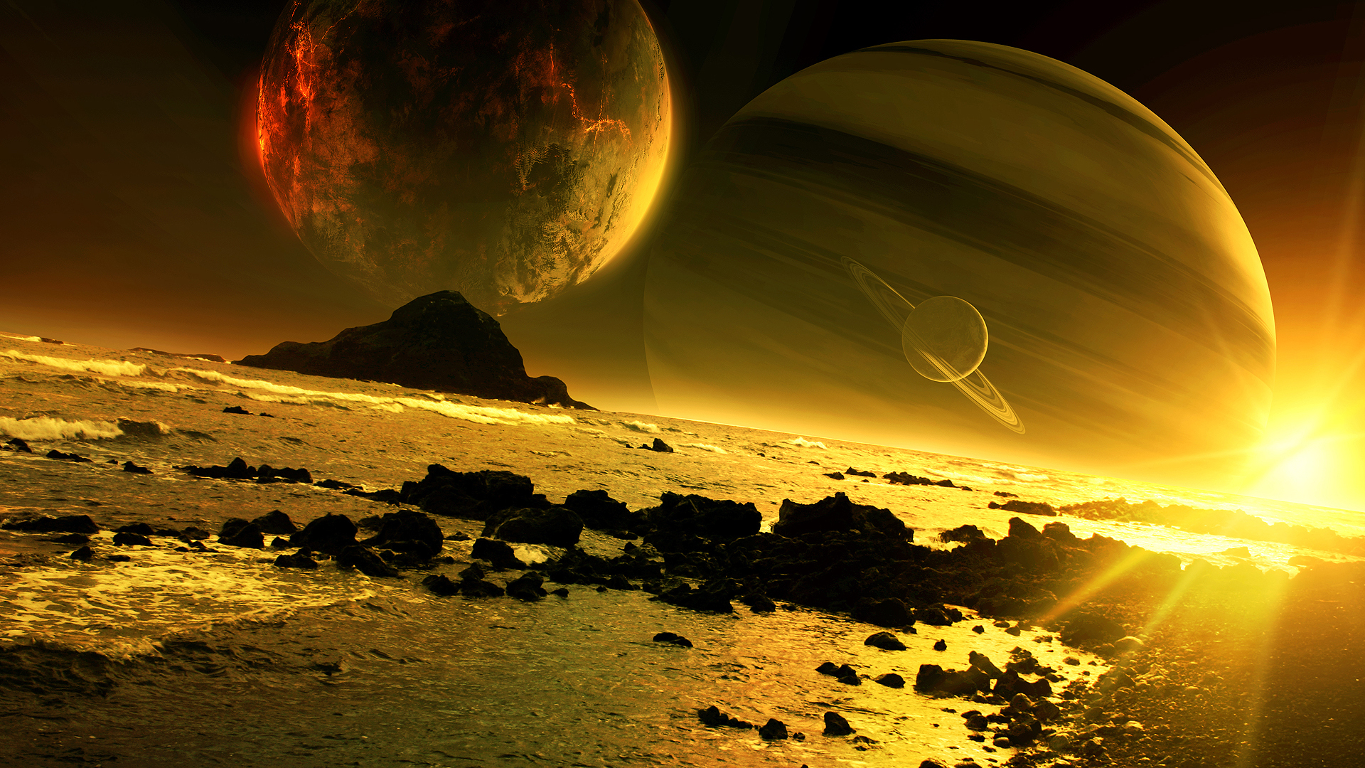 Description: A group of planets in the sky with a sun setting behind them and rocks on the ground below them.