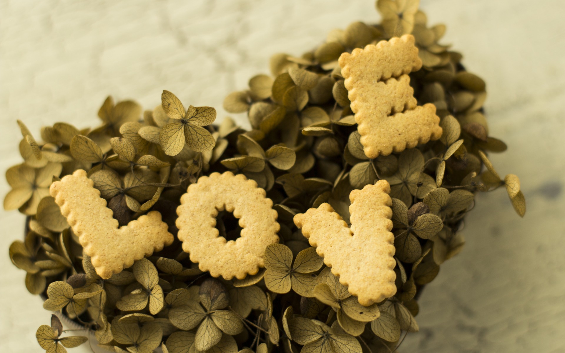 Description: A close up of a plant with cookies in the shape of the word love on it and leaves surrounding it.