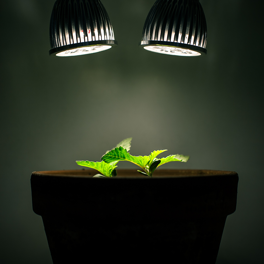 Description: A plant is growing in a pot under two lights on a table with a black chair underneath it and a black lamp above it.