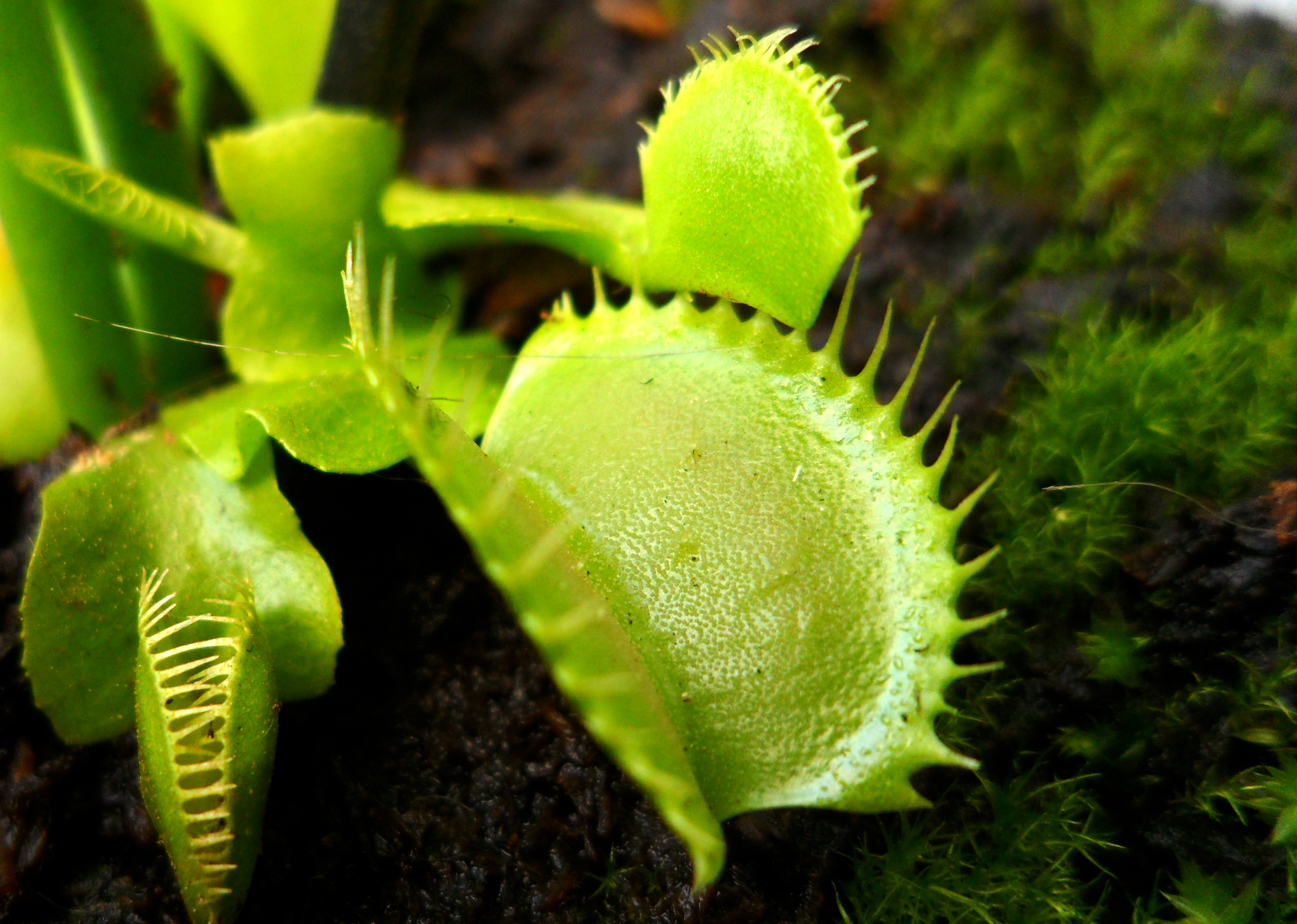Description: A close up of a plant with green leaves and dirt in the background with moss growing on the ground.