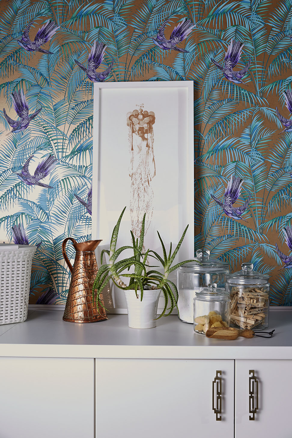 Description: A picture of a plant and a vase on a dresser with a wallpaper behind it and a picture of a woman.
