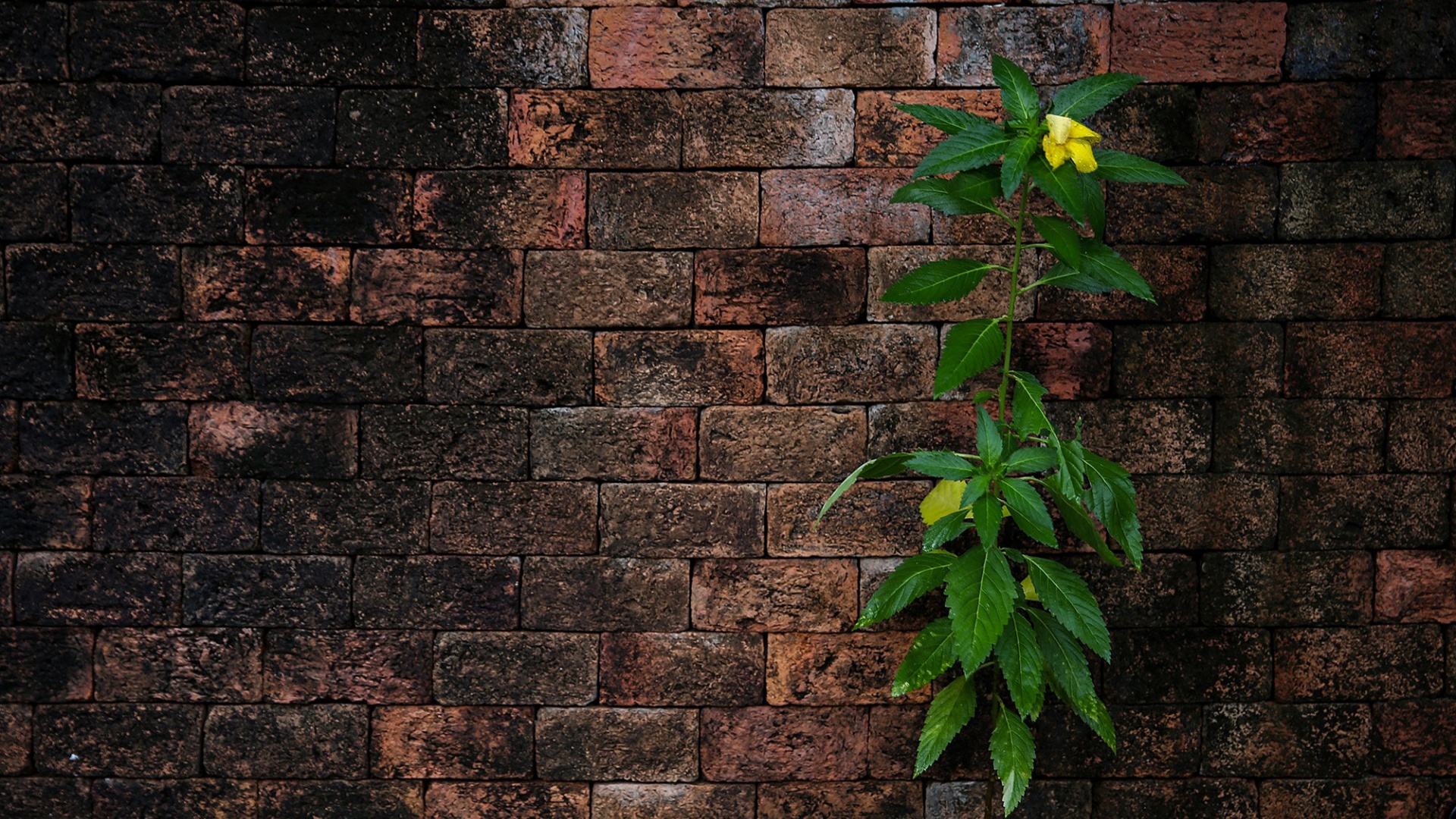 Description: A plant growing out of a brick wall with a yellow flower growing out of it's center of the plant.