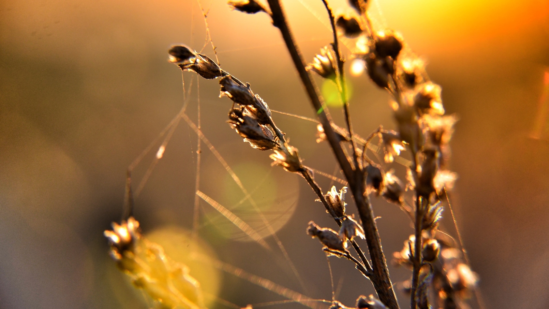 Description: A close up of a plant with water droplets on it's leaves and stems with a yellow background.