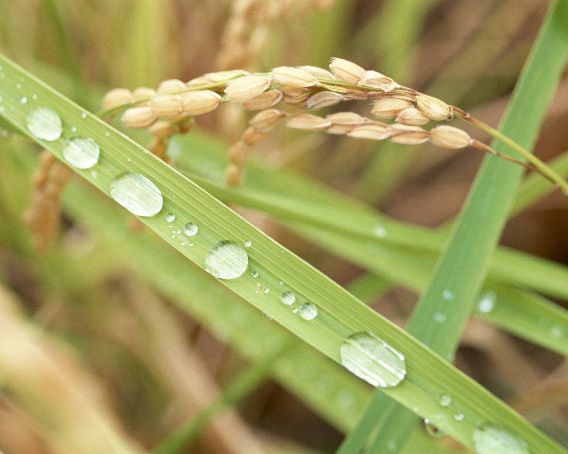 Description: A close up of a plant with water drops on it's leaves and grass in the background with grass and grass in the foreground.