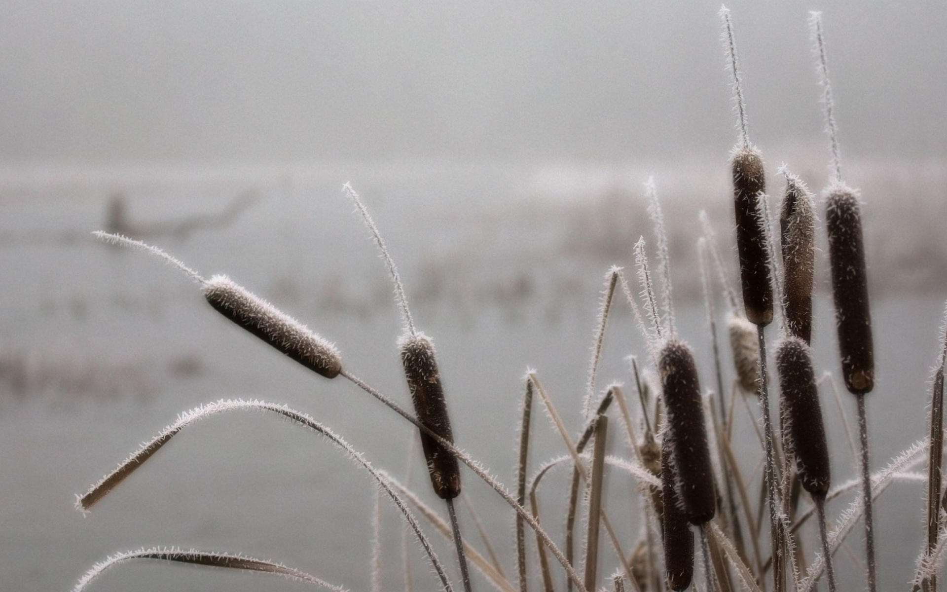 Description: A bunch of plants that are in the snow by the water with a boat in the background on a foggy day.