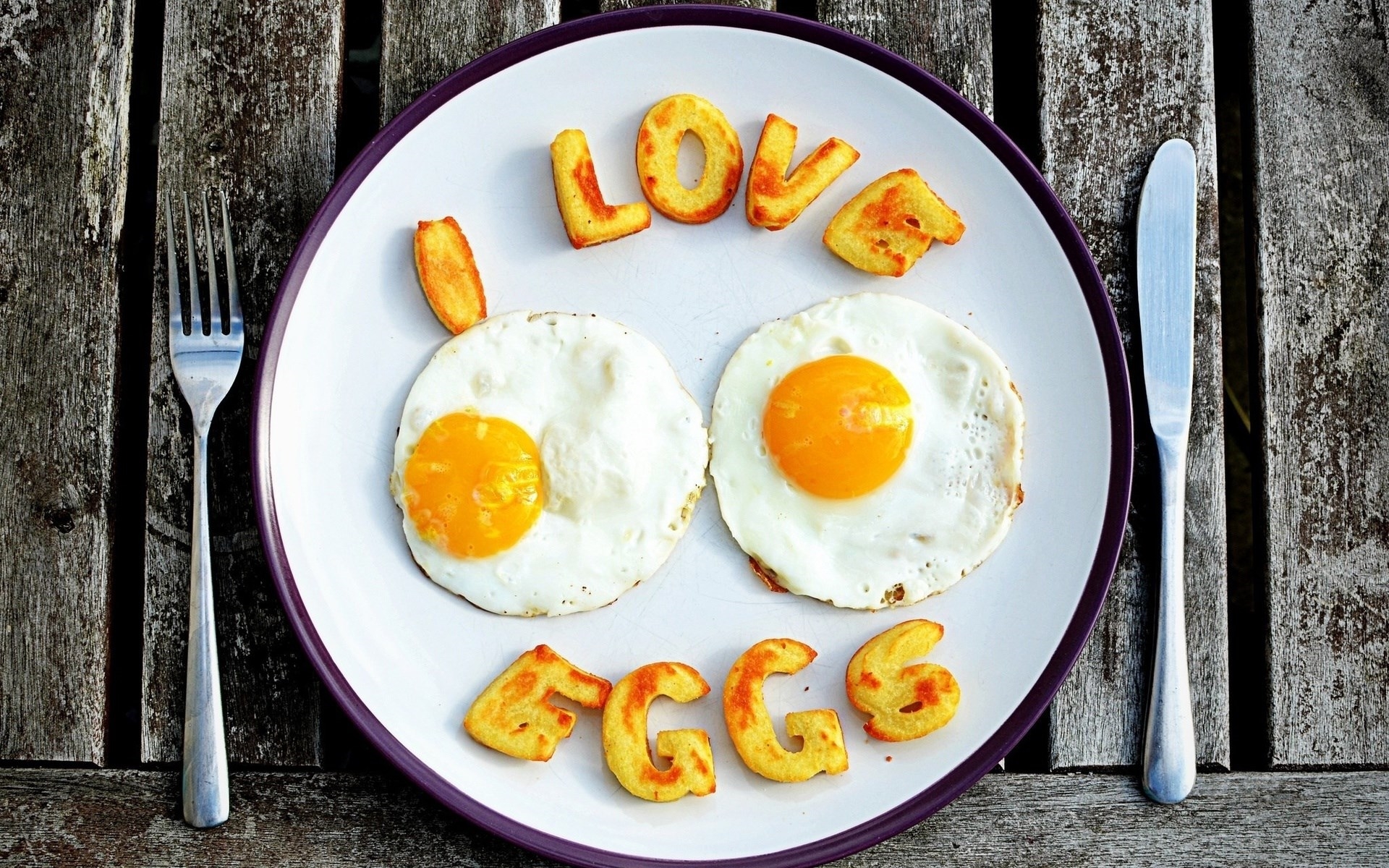 Description: A plate with eggs and some words on it with a fork and knife on the side of the plate.