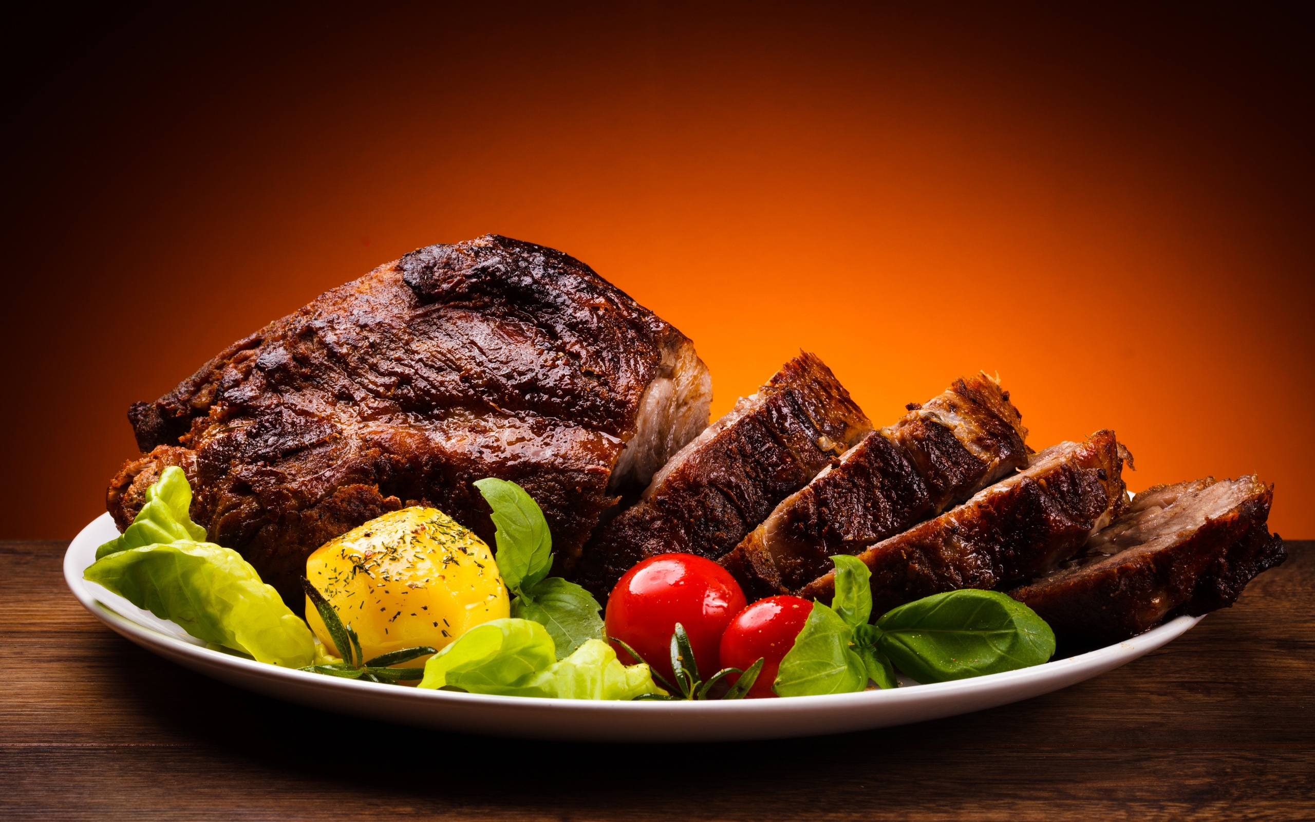 Description: A plate of meat and vegetables on a table with a dark background and a red light behind it.