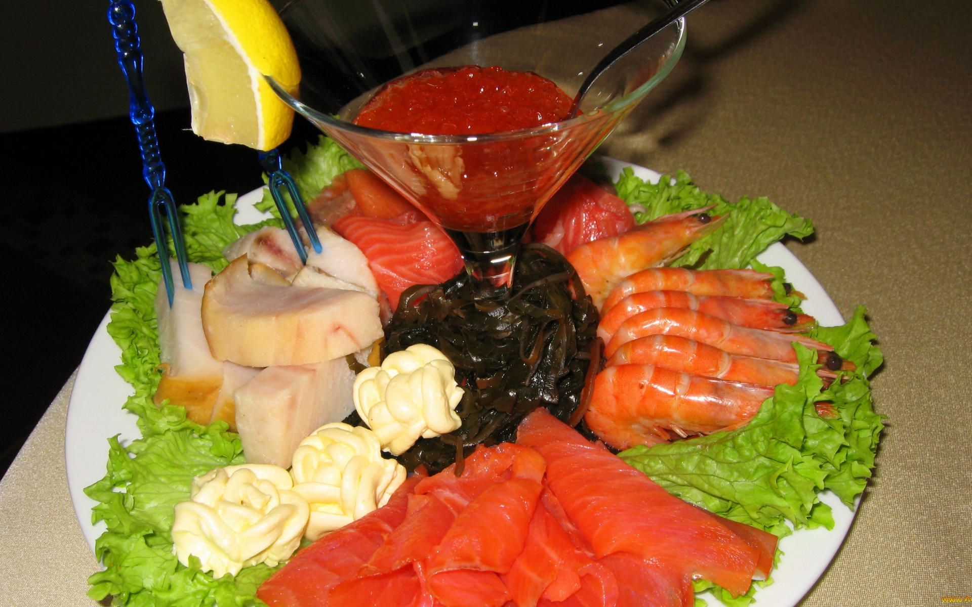 Description: A plate of food with a glass of wine and a lemon wedge on the side of it.