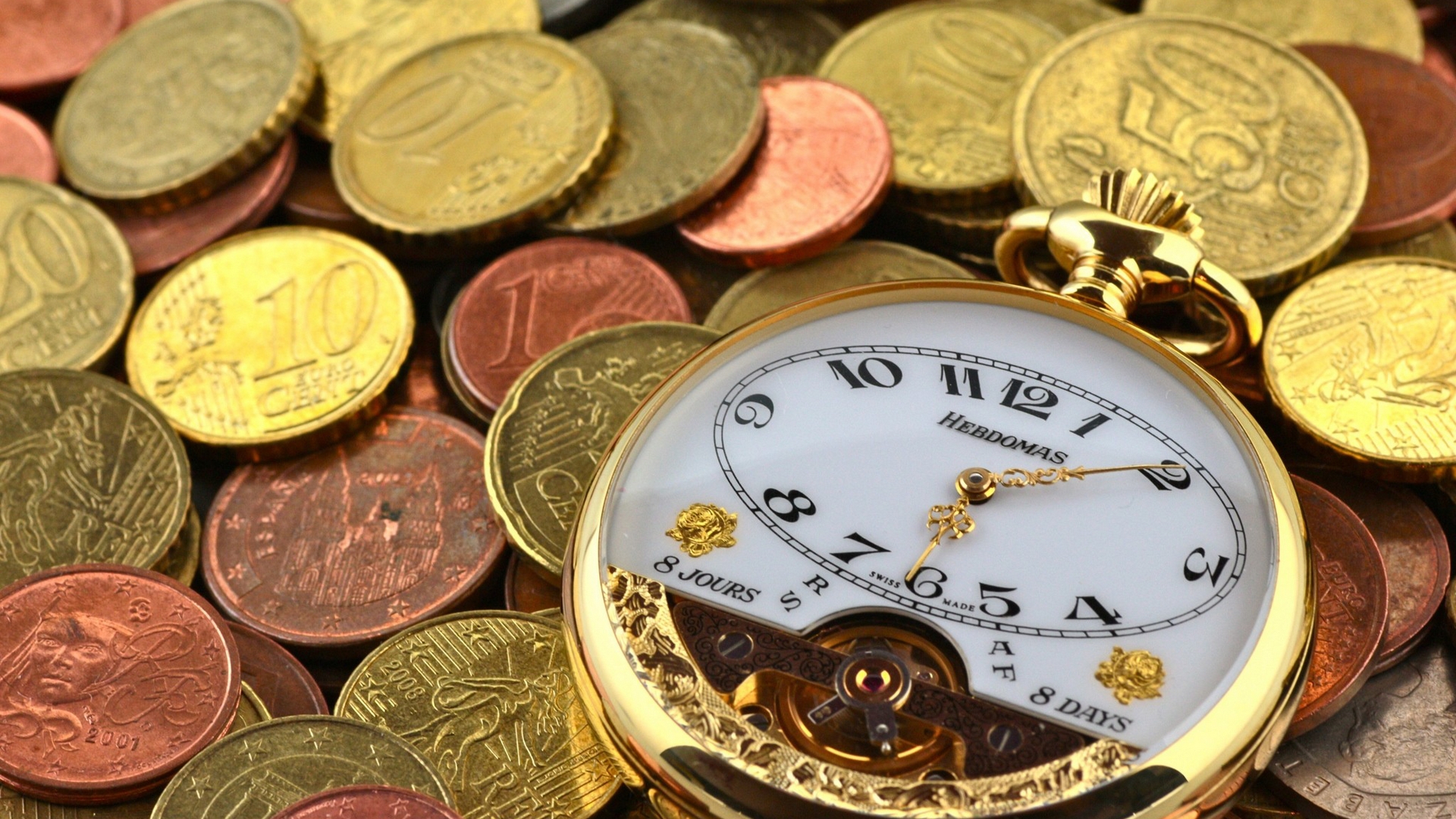 Description: A pocket watch sitting on top of a pile of coins with a gold chain around it's face.