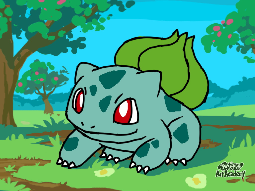 Description: A cartoon of a pokemon with a leaf on its back and eyes wide open.