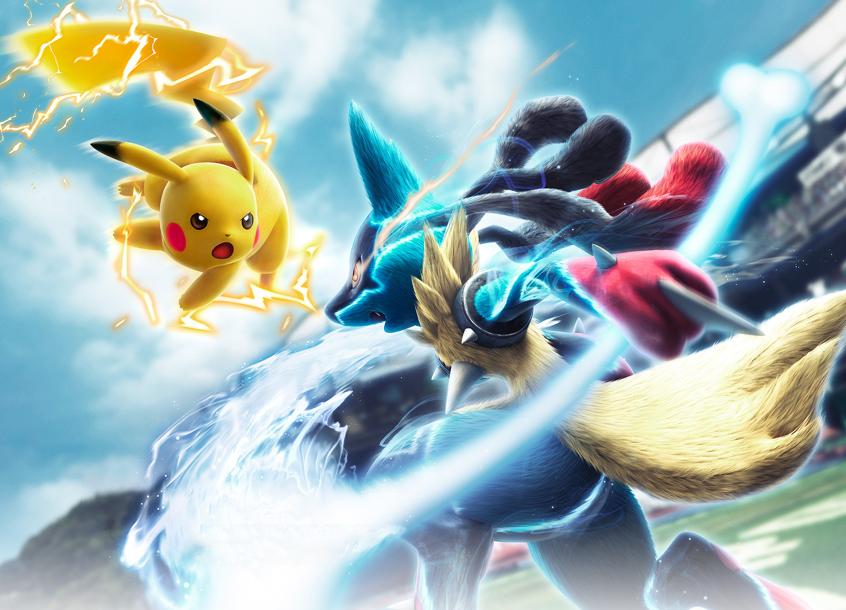 Description: A pokemon game with a lot of different characters in it and a sky background with clouds and buildings in the background.