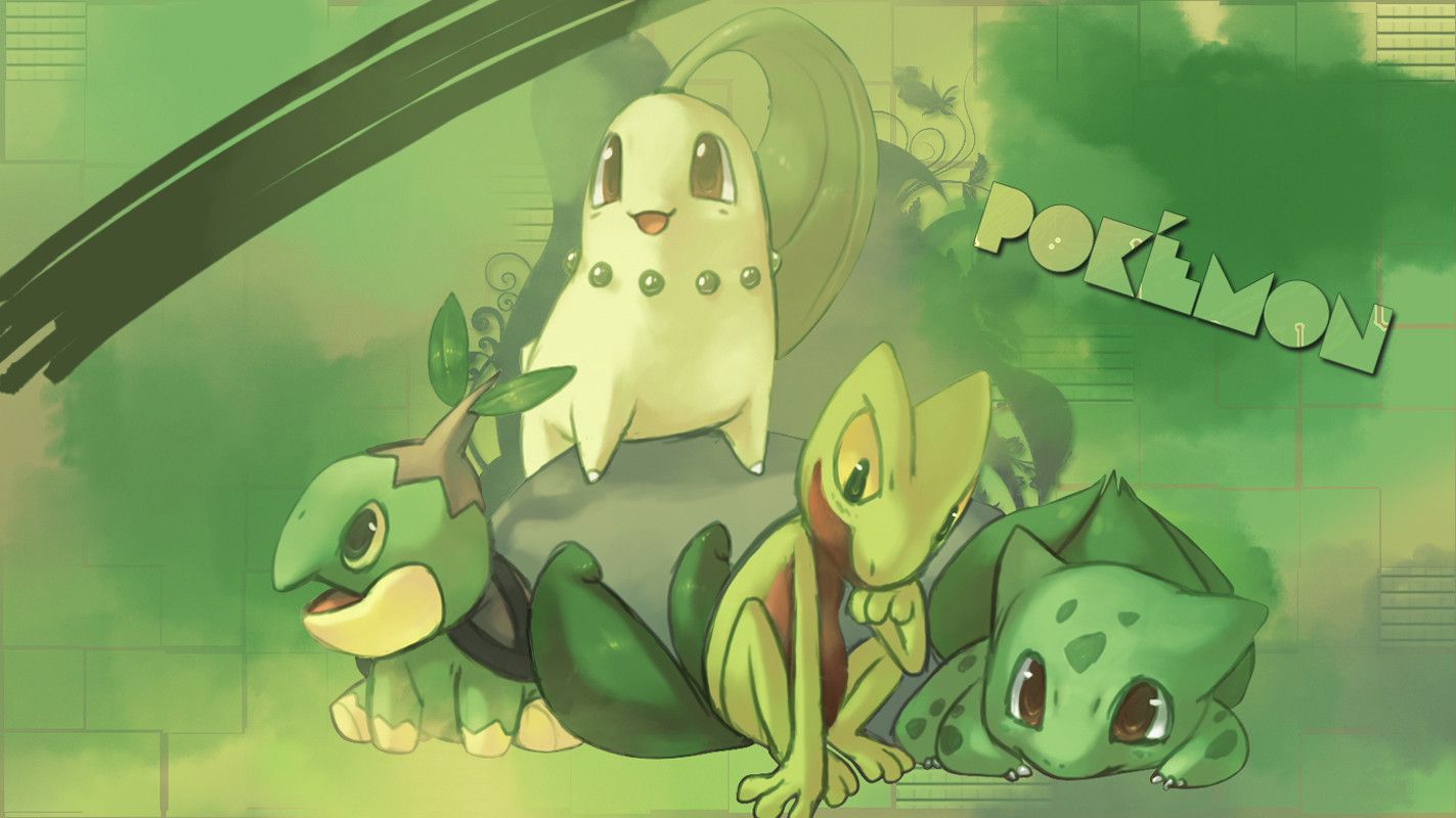 Description: A group of pokemon sitting next to each other on a green background with the word pokemon written in the middle.