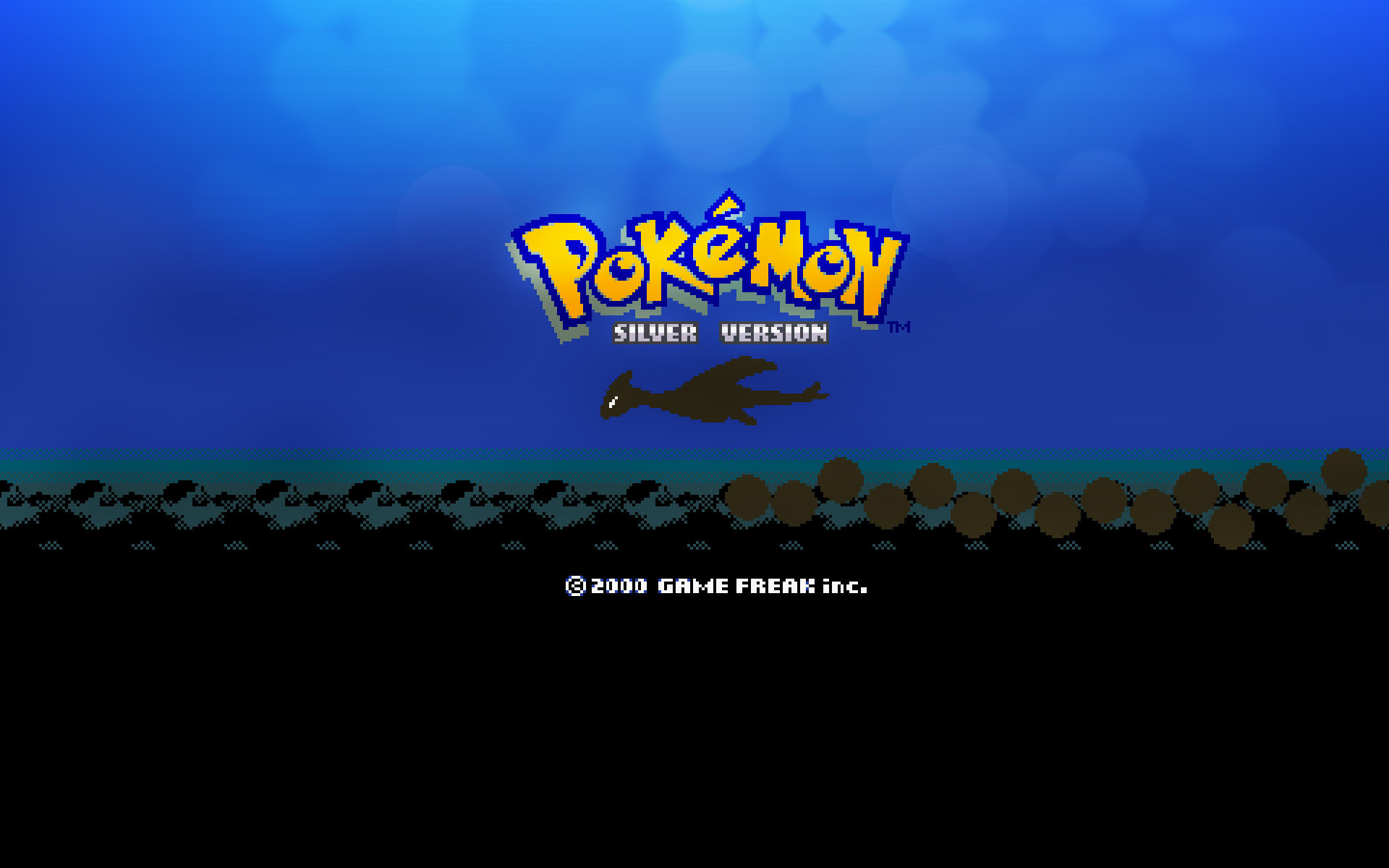 Description: A game screen with a pokemon logo on it and a blue sky in the background with clouds and a bird flying over the ground.