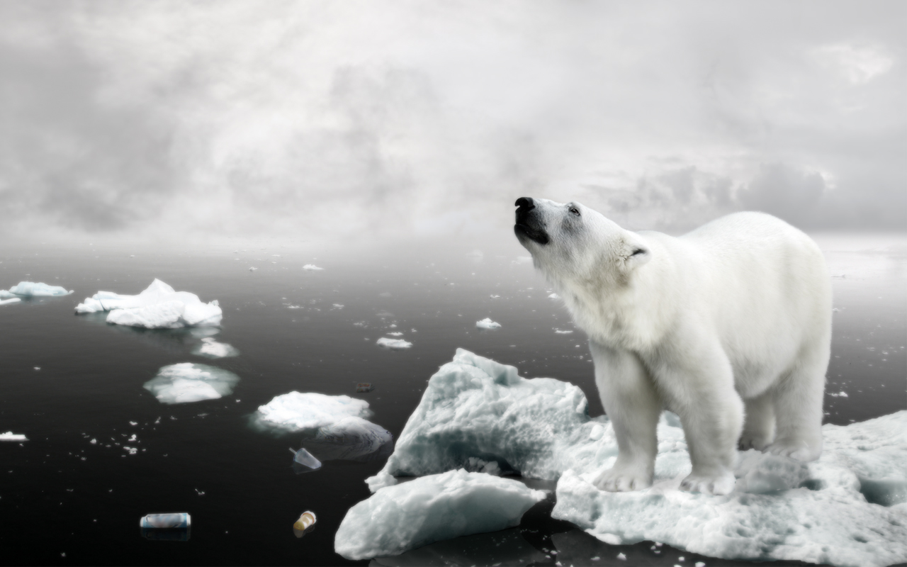 Description: A polar bear standing on top of ice floes in the ocean with a cloudy sky above it and a few pieces of ice floating in the water.