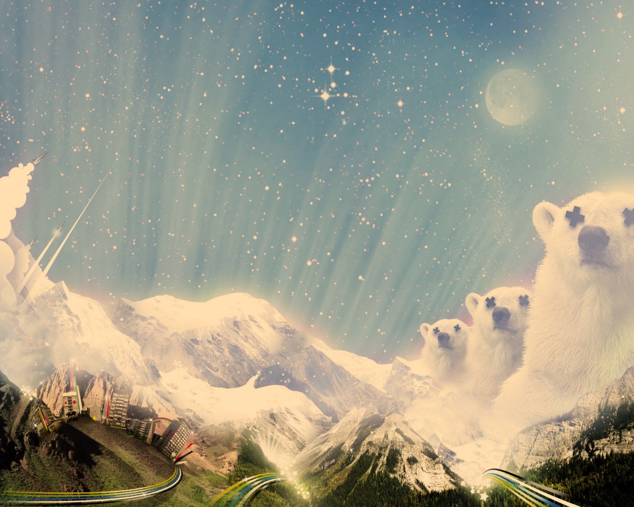 Description: A painting of a polar bear with a mountain background and stars in the sky above it.