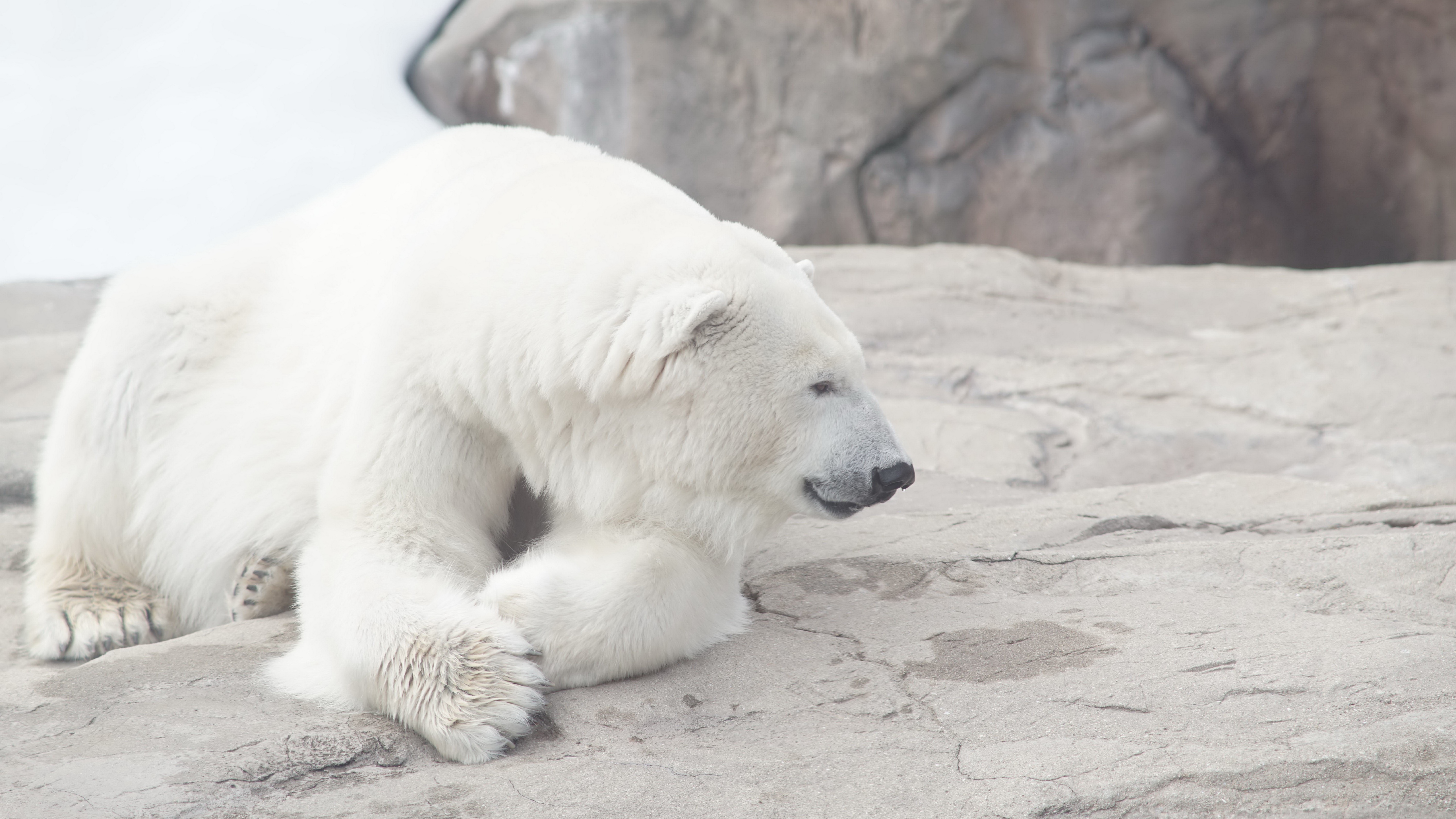 Description: A polar bear laying on a rock in a zoo enclosure at the zoo.