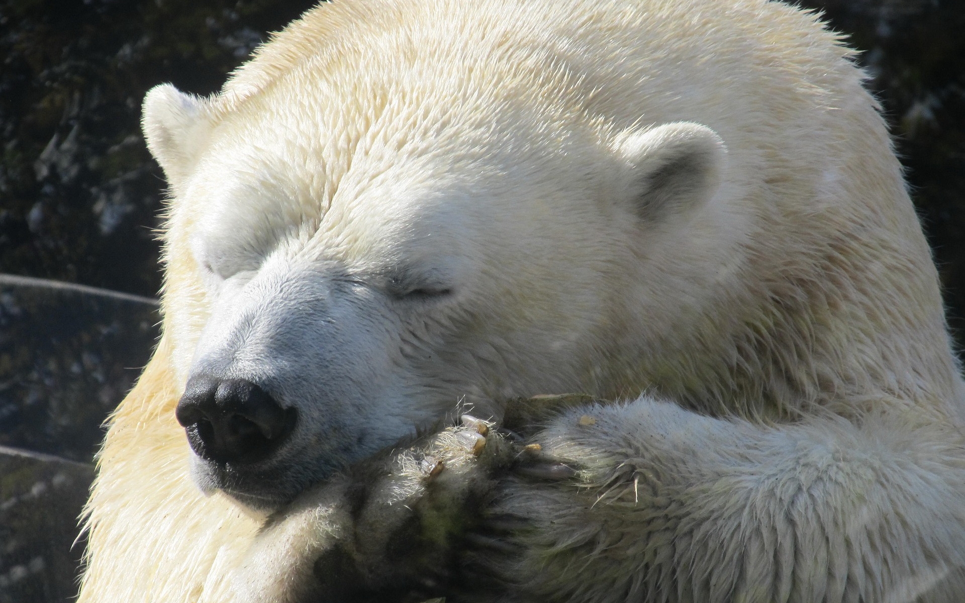 Description: A polar bear is sleeping on its back with its head on its paw.