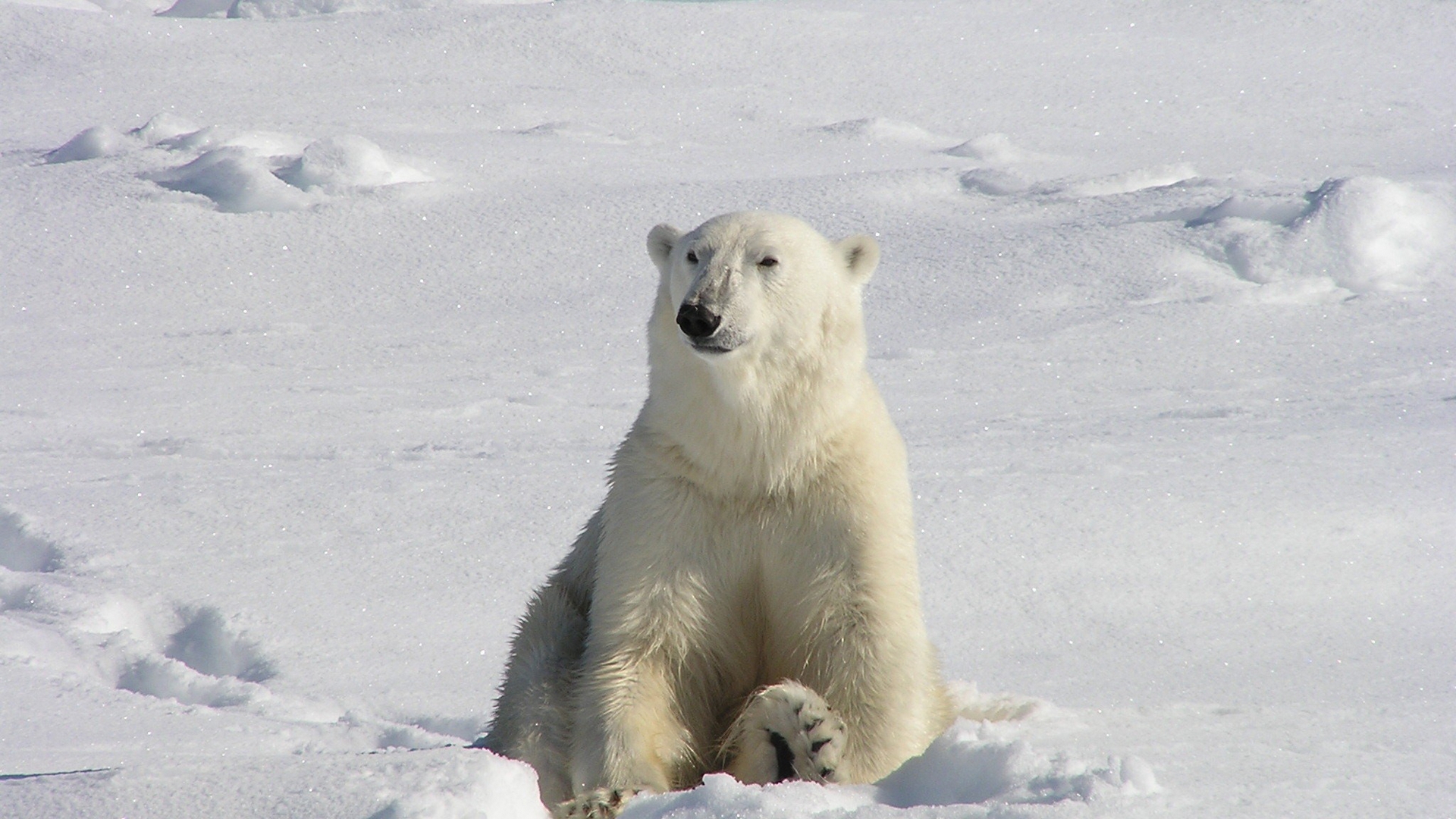 Description: A polar bear sitting in the snow looking at the camera lens of the camera man's eye view.