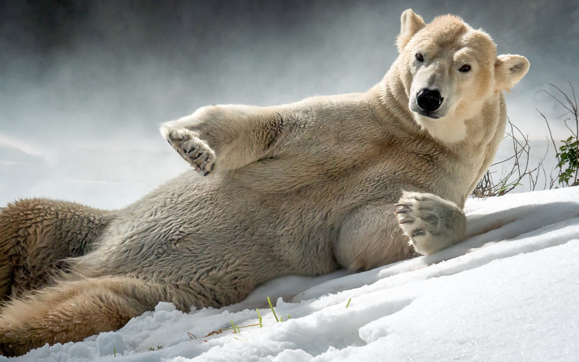 Description: A polar bear is sitting in the snow and stretching his legs up to the side of the bear.
