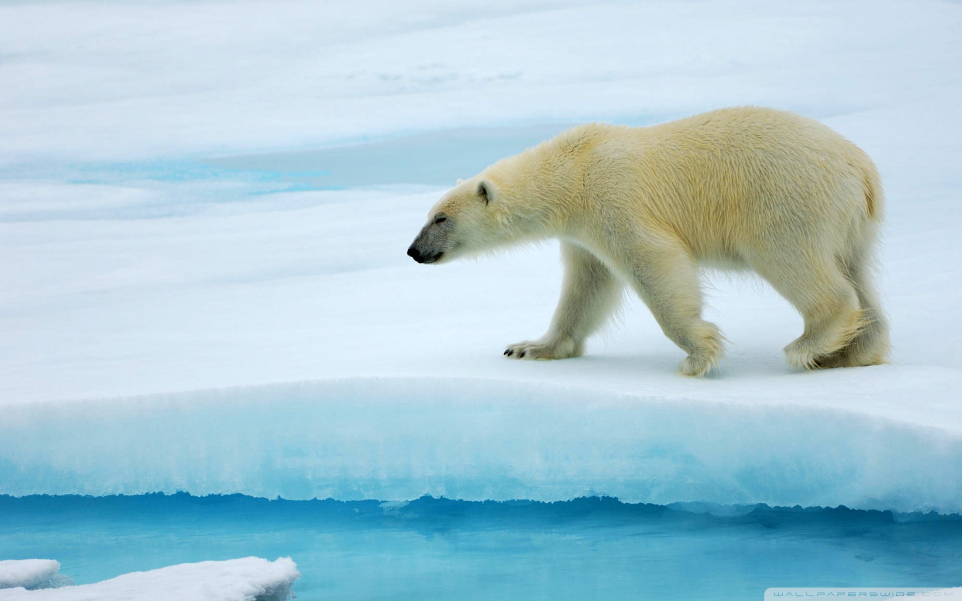 Description: A polar bear walking across a frozen lake in the snow.