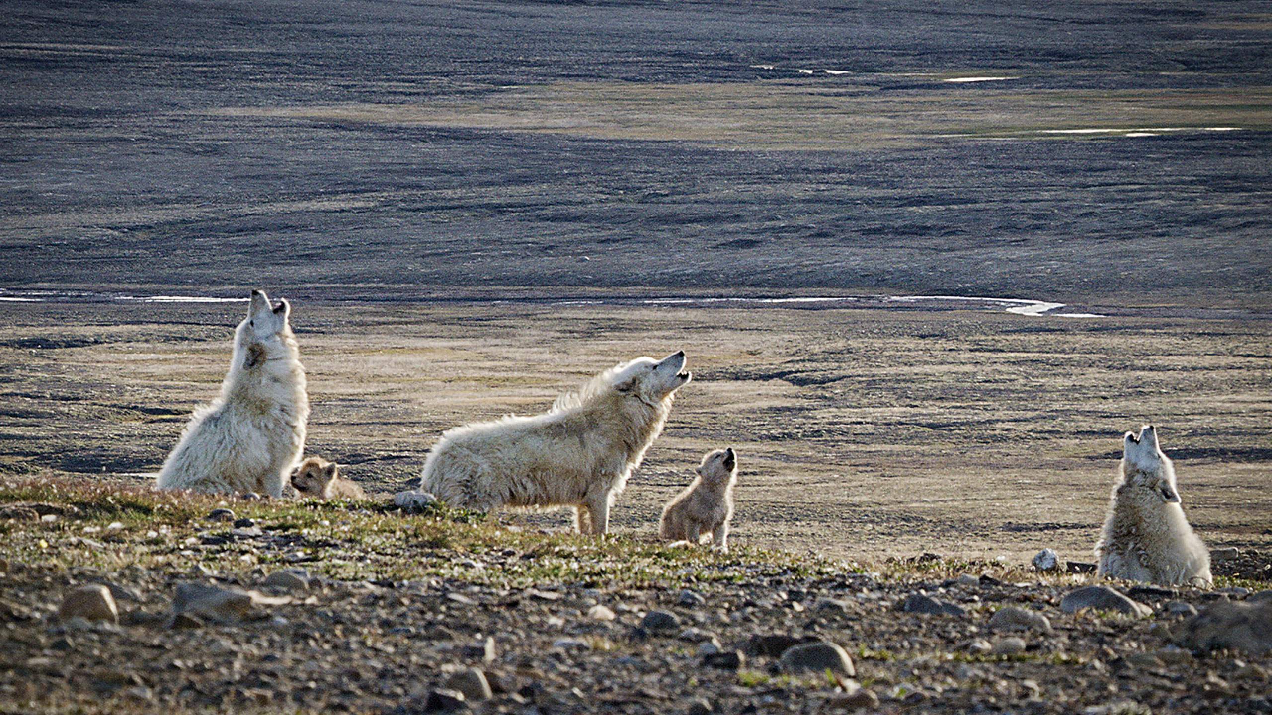 Description: A group of polar bears sitting on top of a rocky hillside next to a lake and a mountain range.