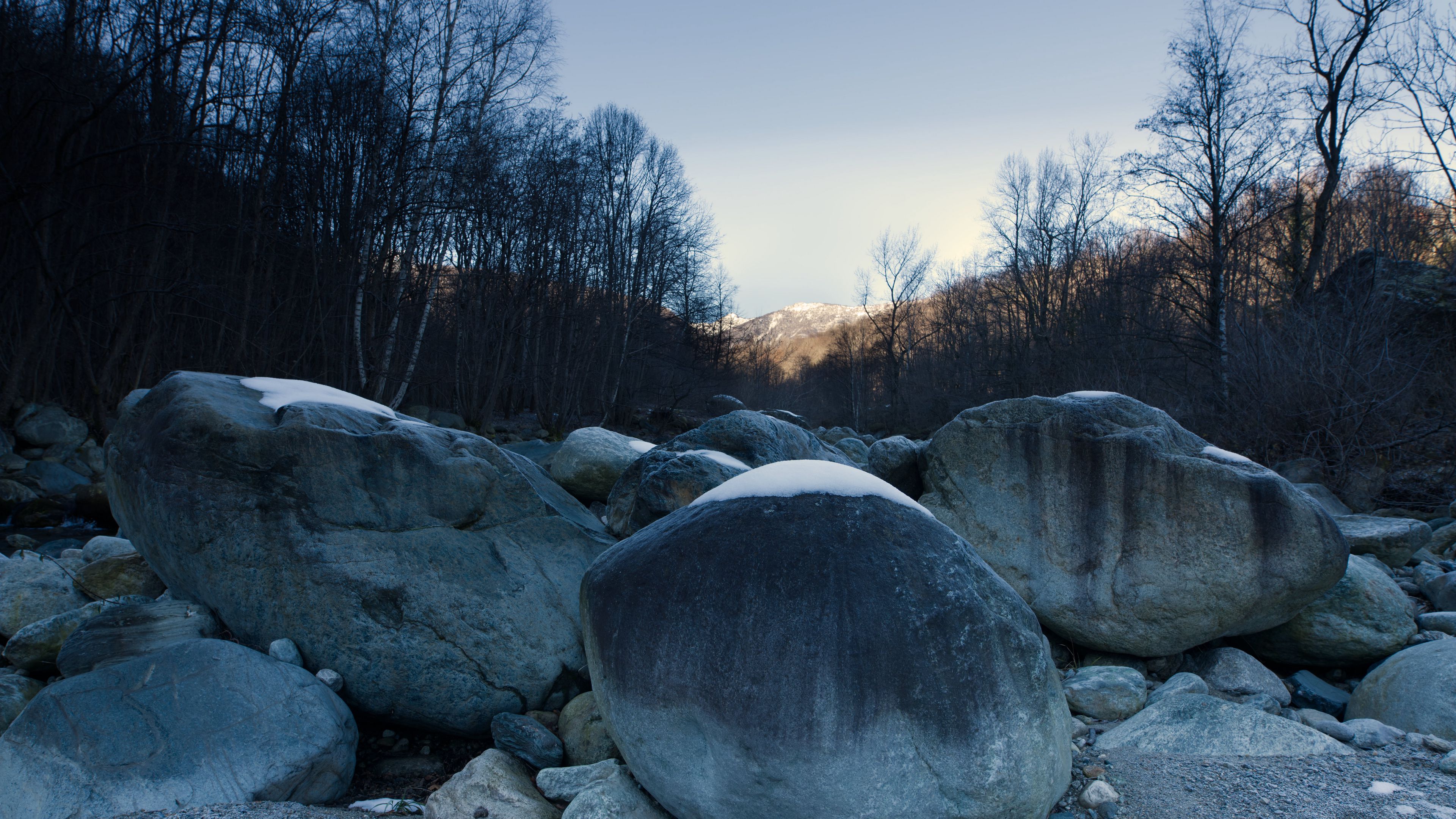 Description: A bunch of rocks that are sitting on the ground in the snow and some trees in the background and a sky.
