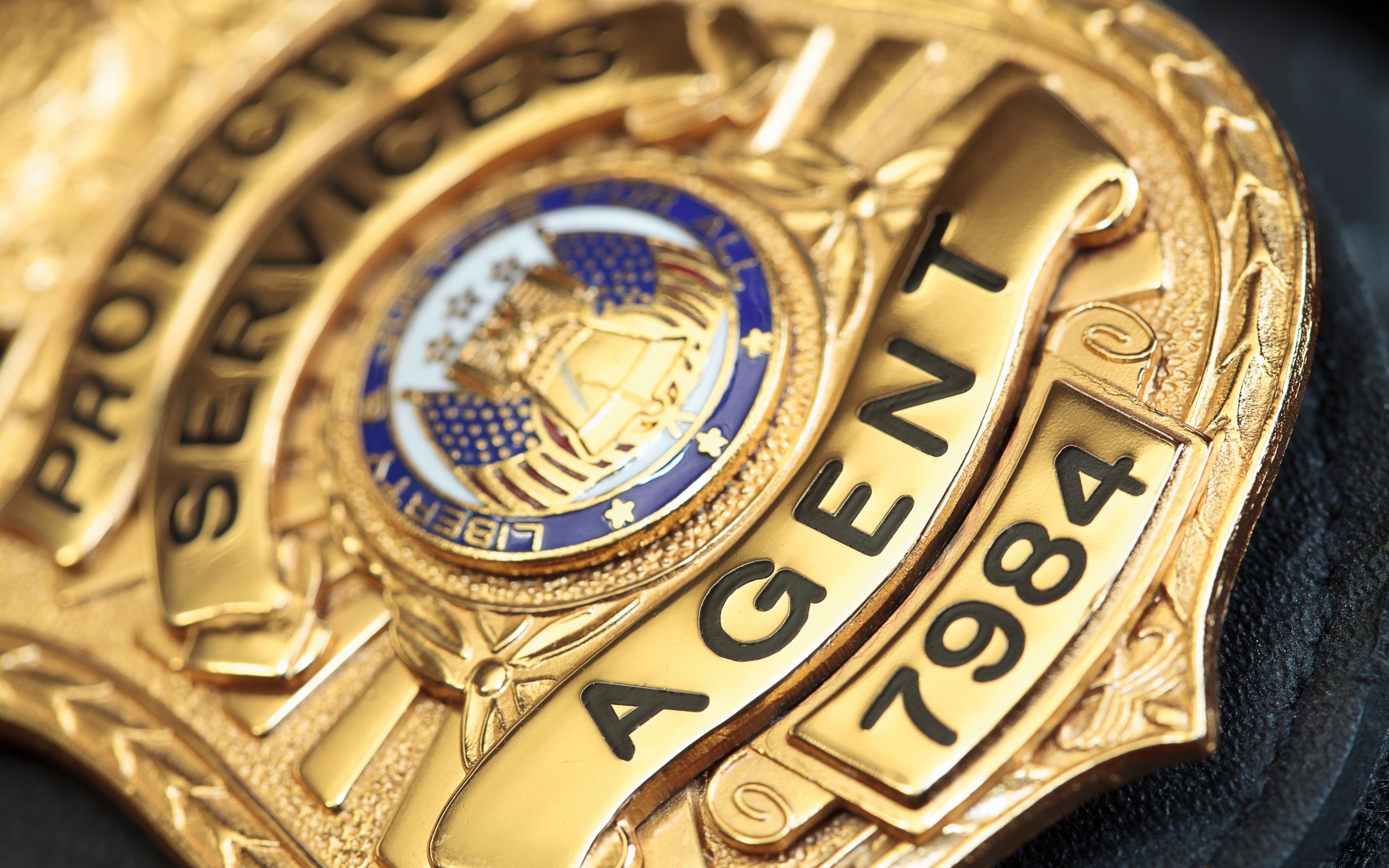 Description: A police badge is shown on a black jacket with a blue and gold stripe around it's collar.