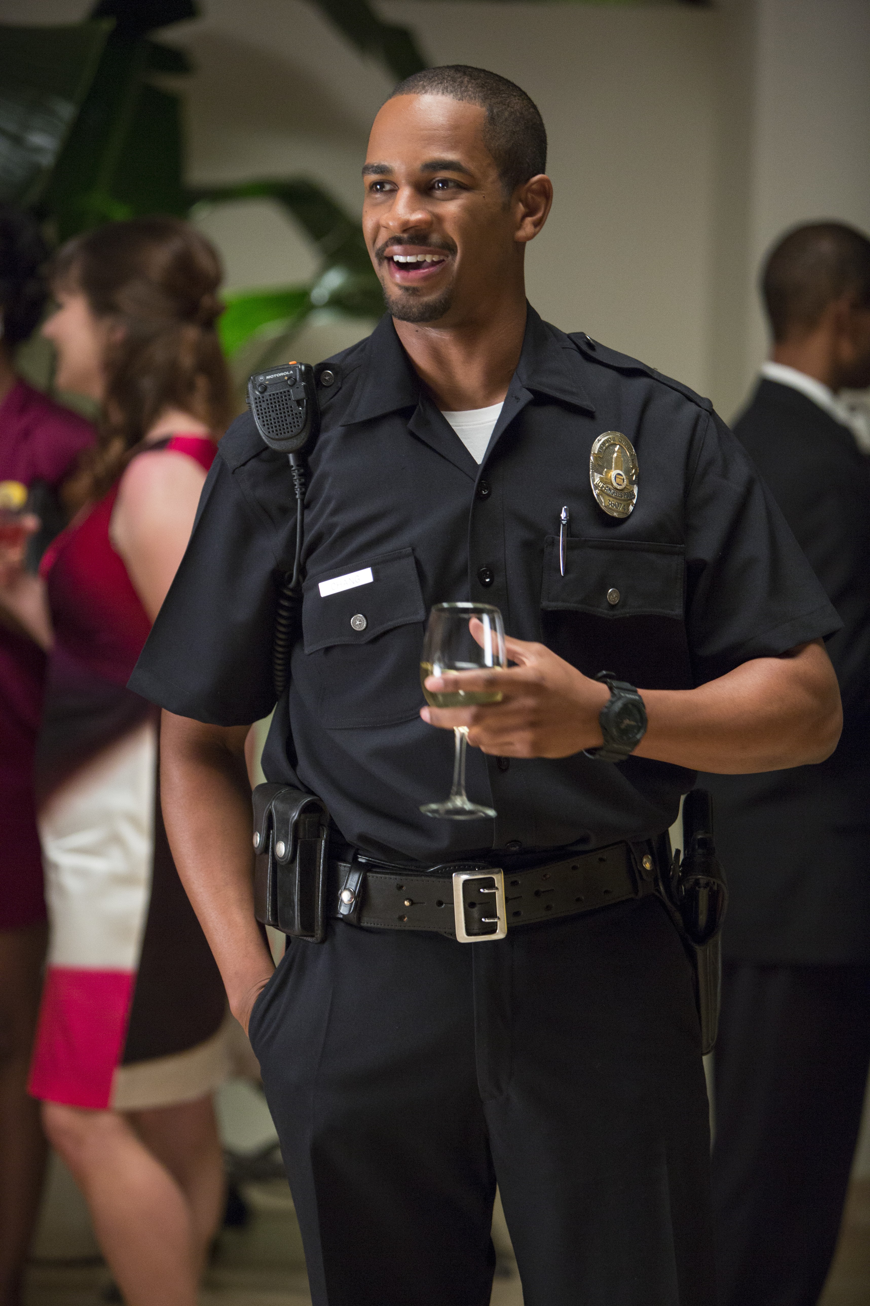 Description: A man in a police uniform holding a glass of wine in his hand and smiling at the camera while standing in a room full of people.