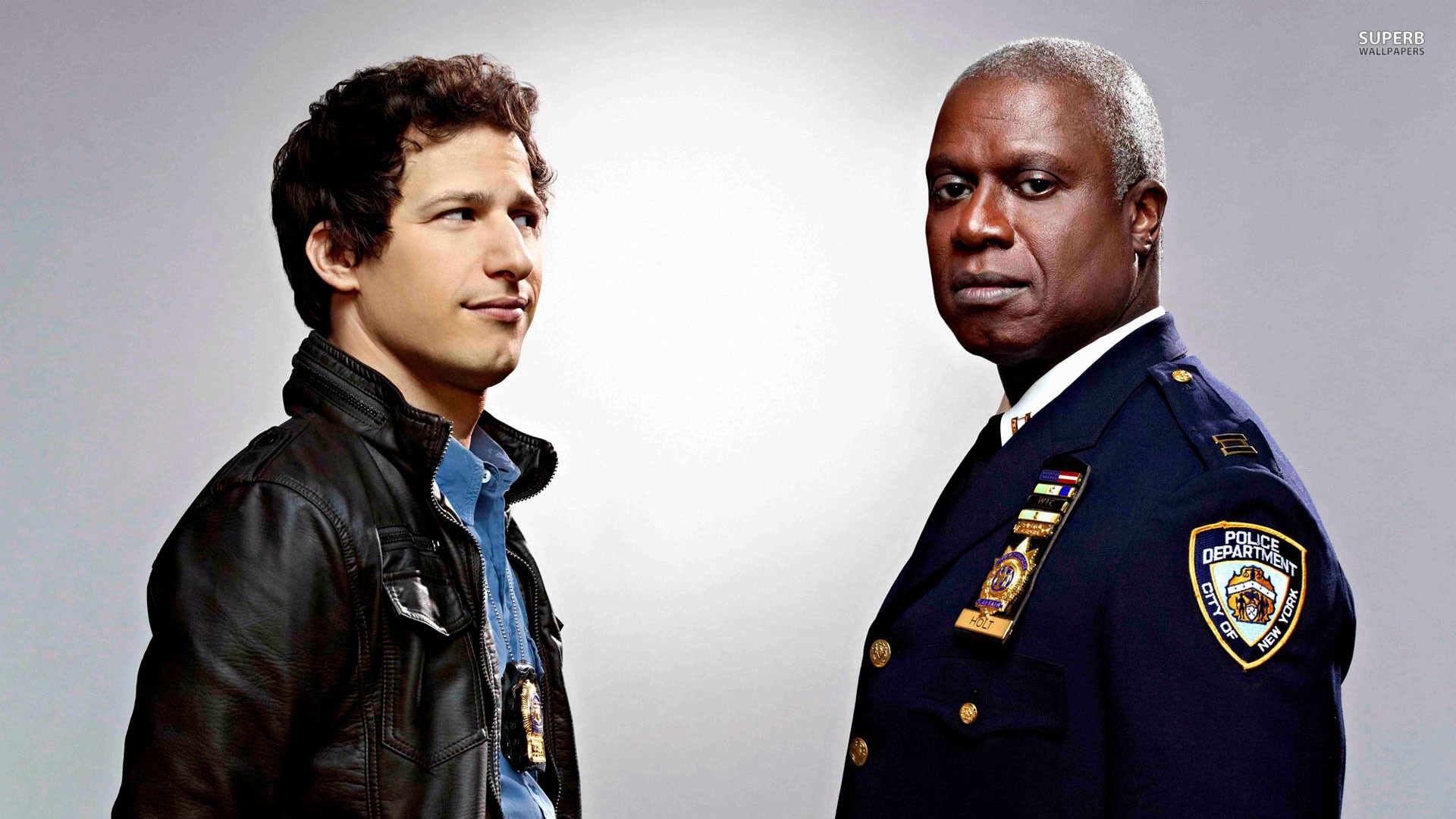 Description: Two men in police uniforms standing next to each other in front of a white background with a gray background.