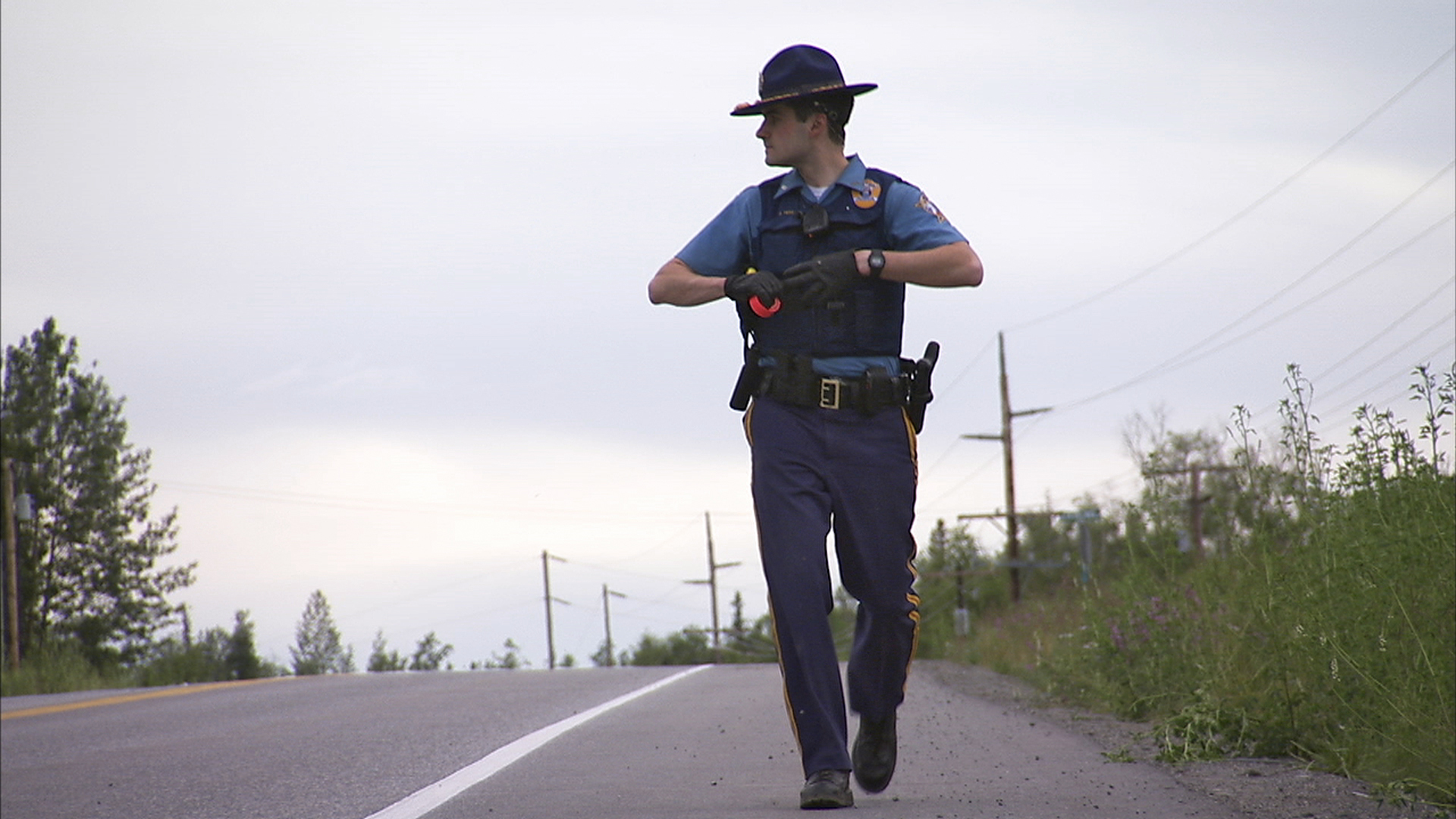 Description: A police officer running down a road with a gun in his hand and a hat on his head and a gun in his hand.