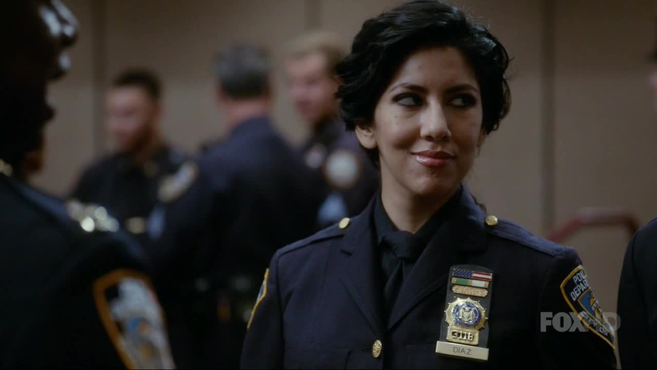 Description: A woman in a police uniform standing in a room with other people in the background and a man in a suit and tie.