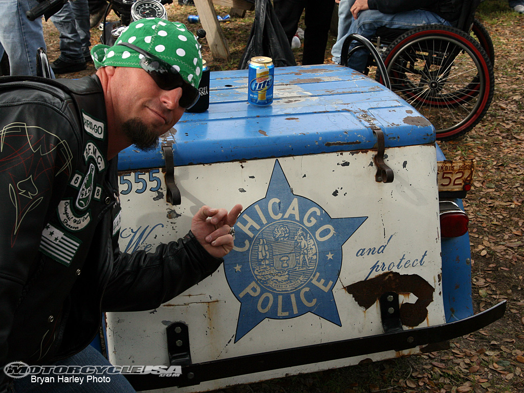 Description: A man in a polka dot hat is leaning on a police box with a beer in it and a green hat.