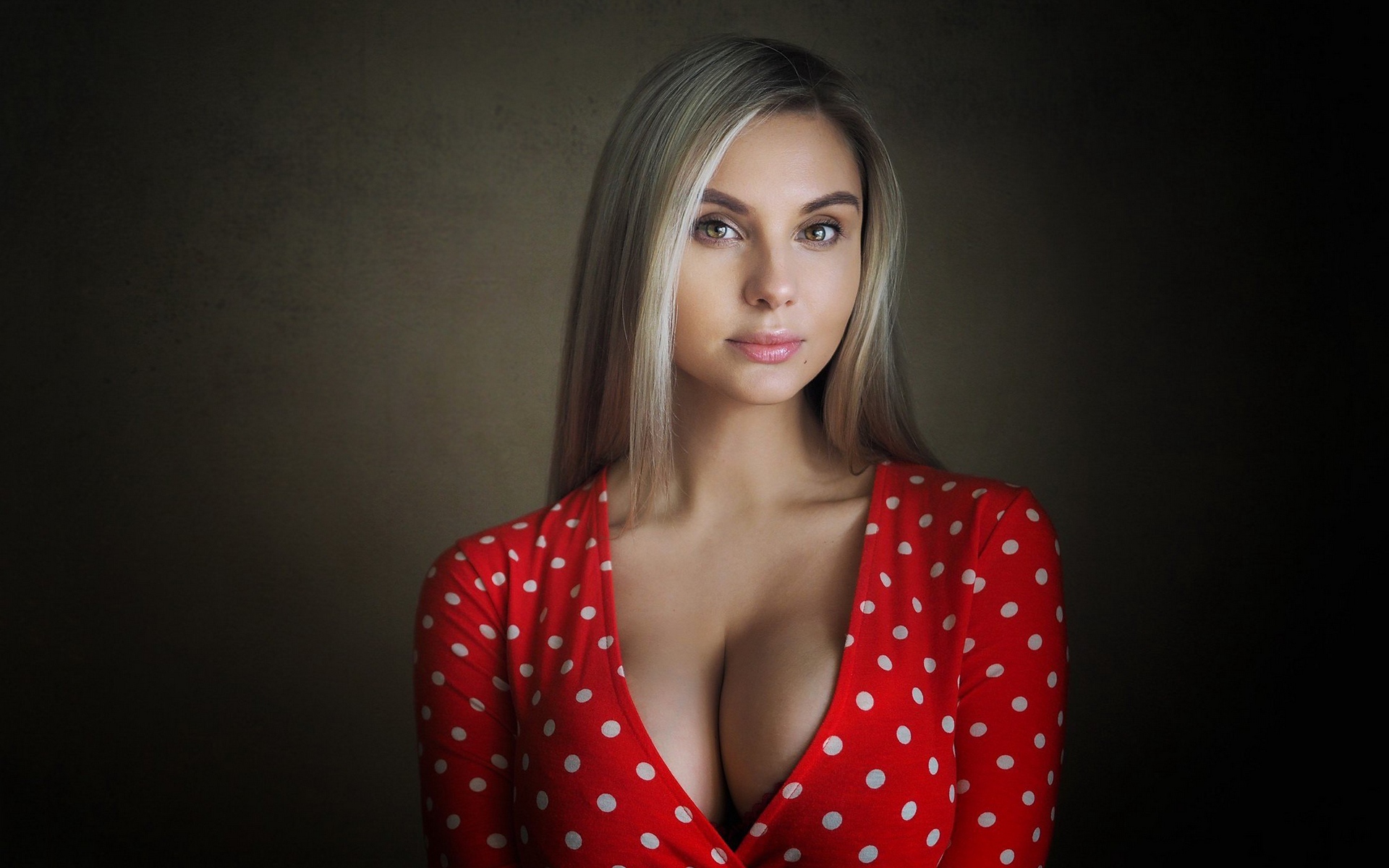 Description: A woman with a red and white polka dot shirt posing for a picture with her breast exposed and a black background.