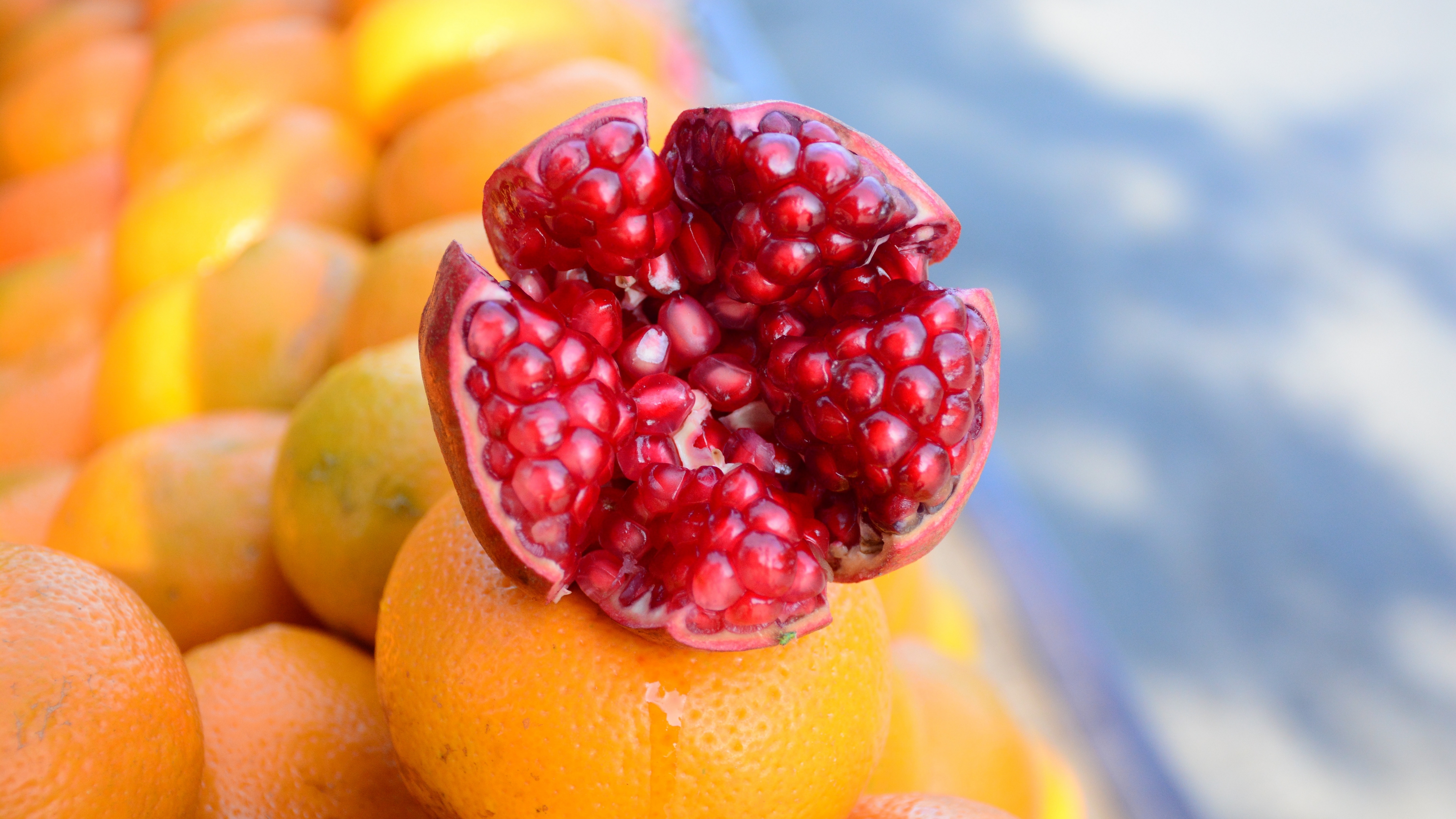 Description: A pomegranate is sitting on top of a pile of oranges and lemons in a blue bowl.