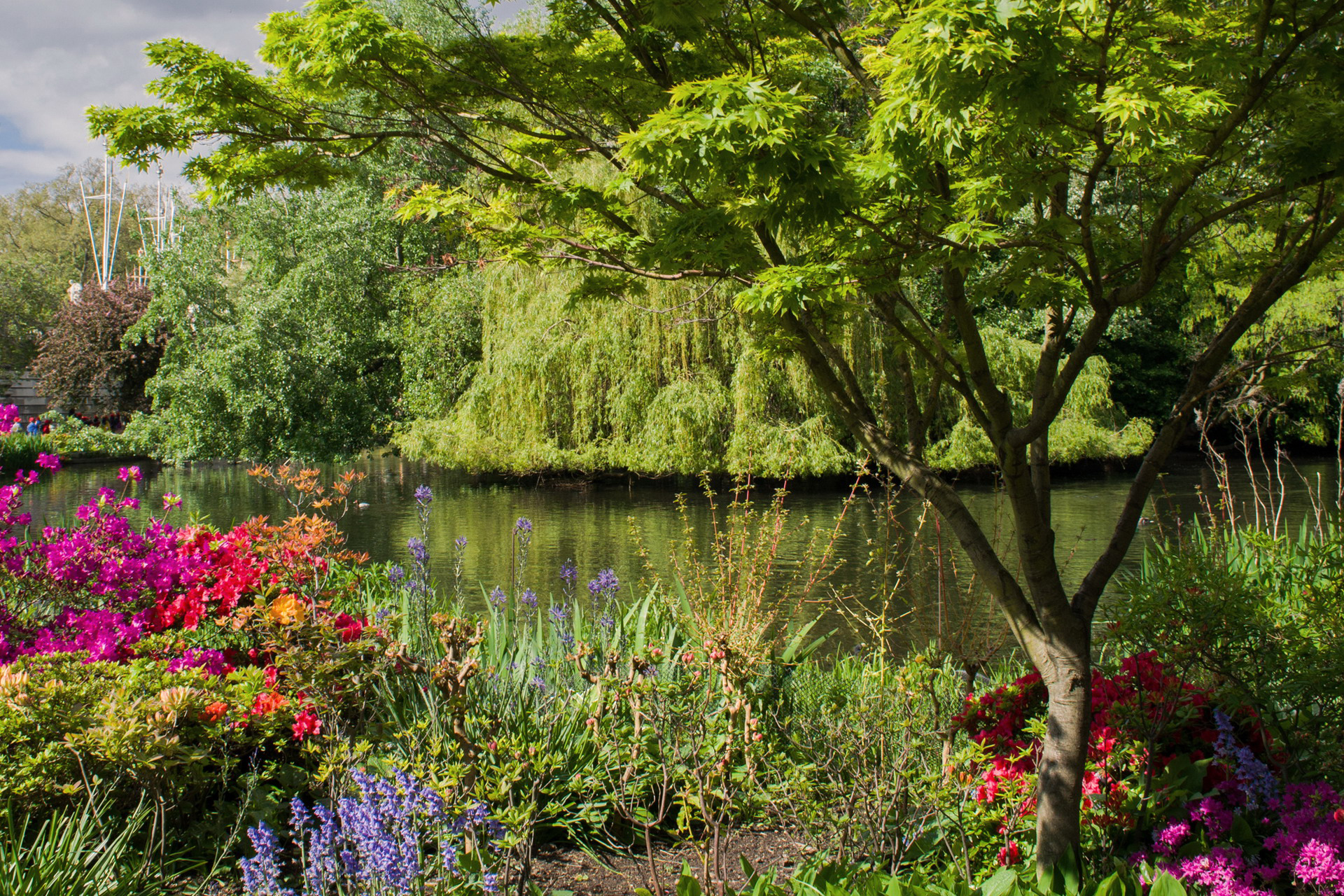 Description: A pond surrounded by flowers and trees in a park area with a bridge in the background and a few clouds in the sky.
