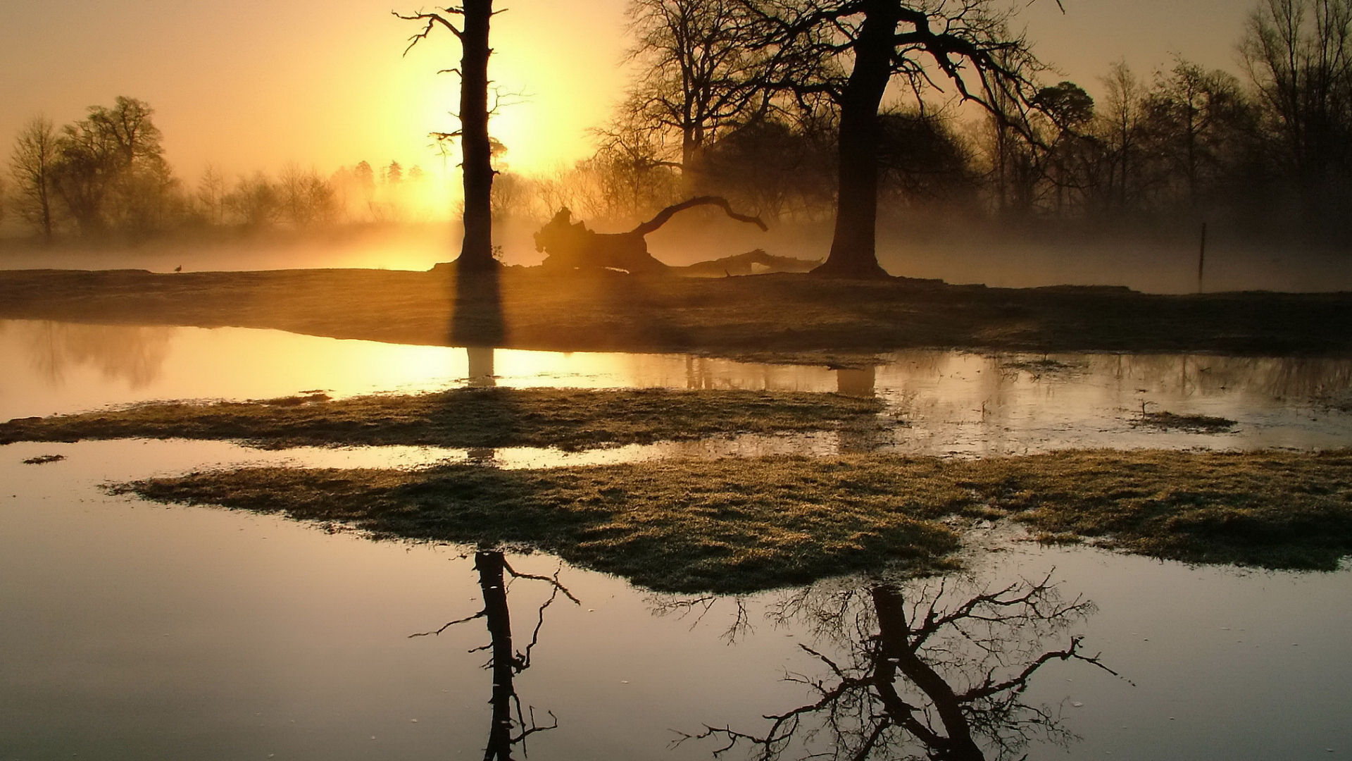 Description: A pond with grass and trees in the background at sunset or dawn with fog in the air and a few trees in the foreground.