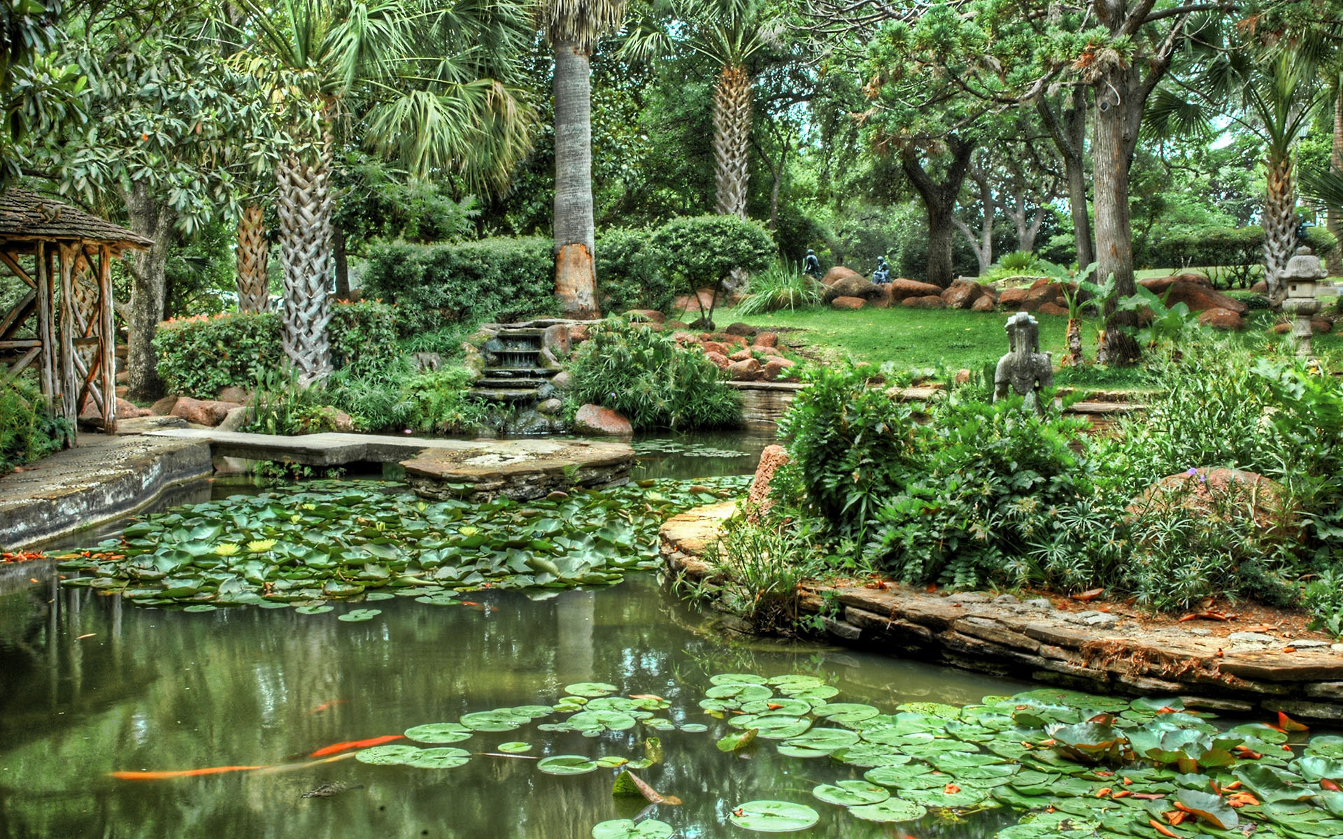 Description: A pond with a gazebo and a lot of water lilies in it and a statue in the middle.