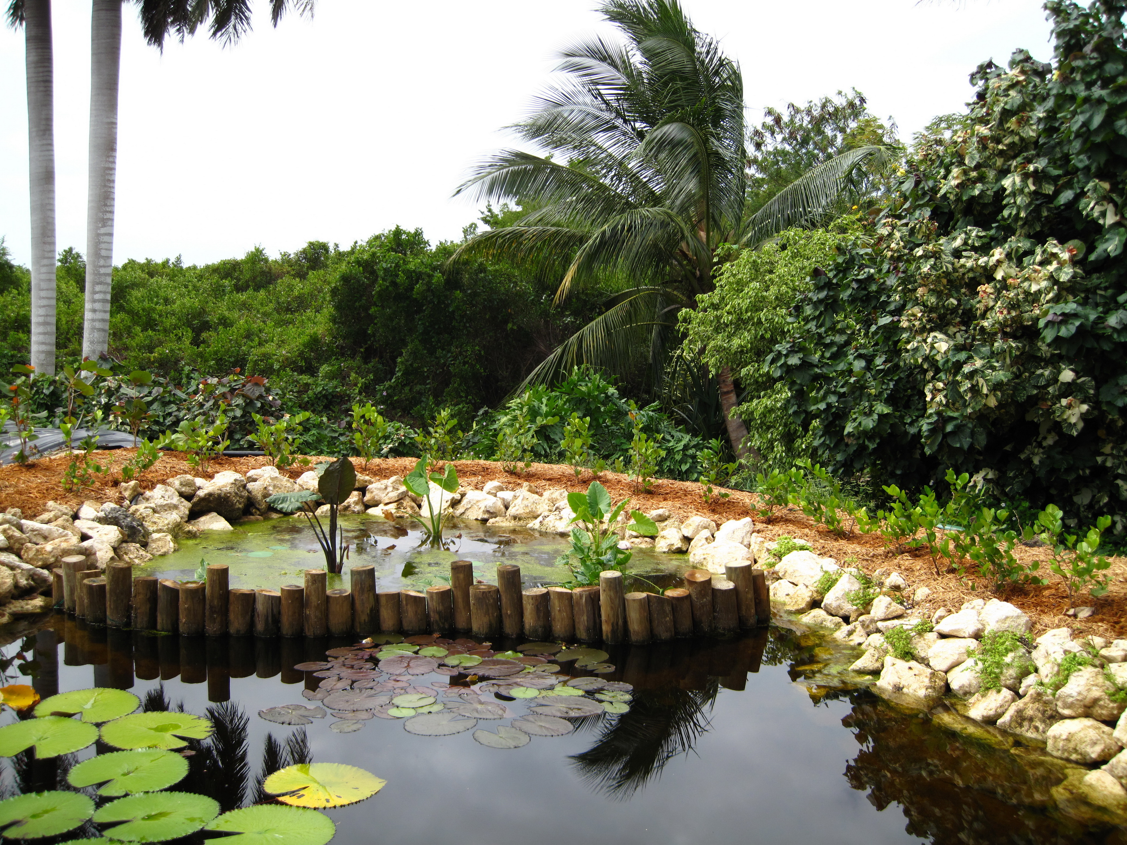 Description: A pond with lily pads and a bird in it in a garden area with trees and rocks and a pond.
