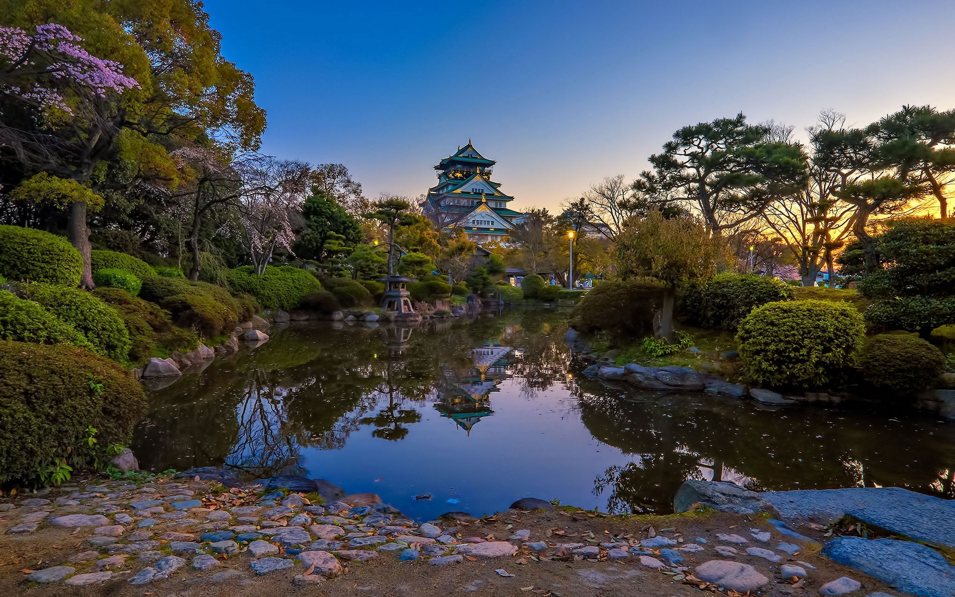 Description: A pond surrounded by trees and rocks in a park at sunset with a pagoda in the background and a few people walking around.