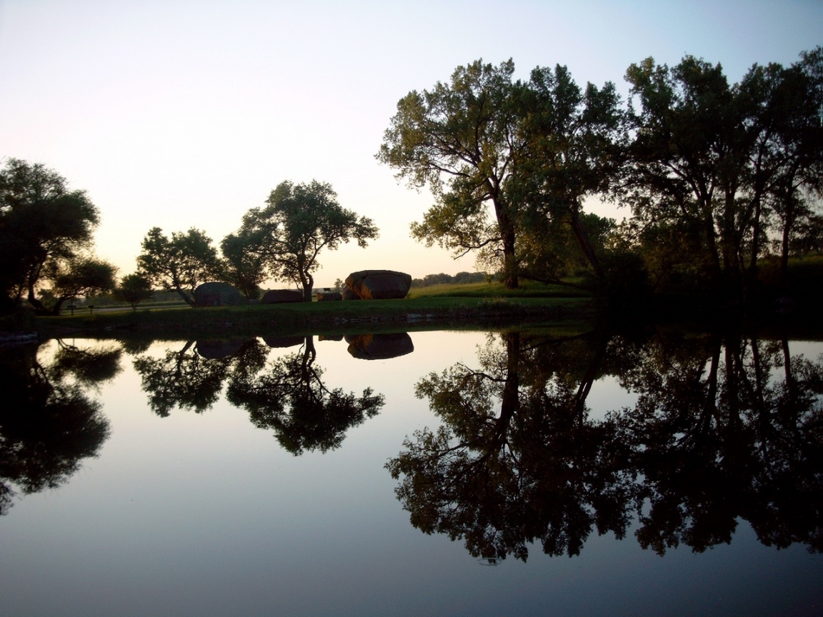 Description: A pond with trees and a house in the background at sunset or dawn or dawn or dawn or dawn.
