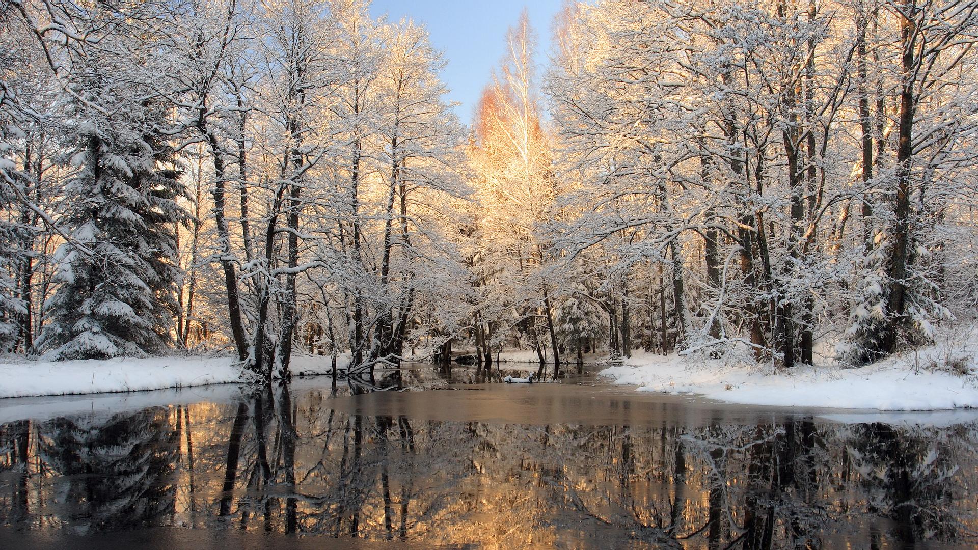 Description: A pond surrounded by trees covered in snow with a few trees in the background and a few snow covered branches.