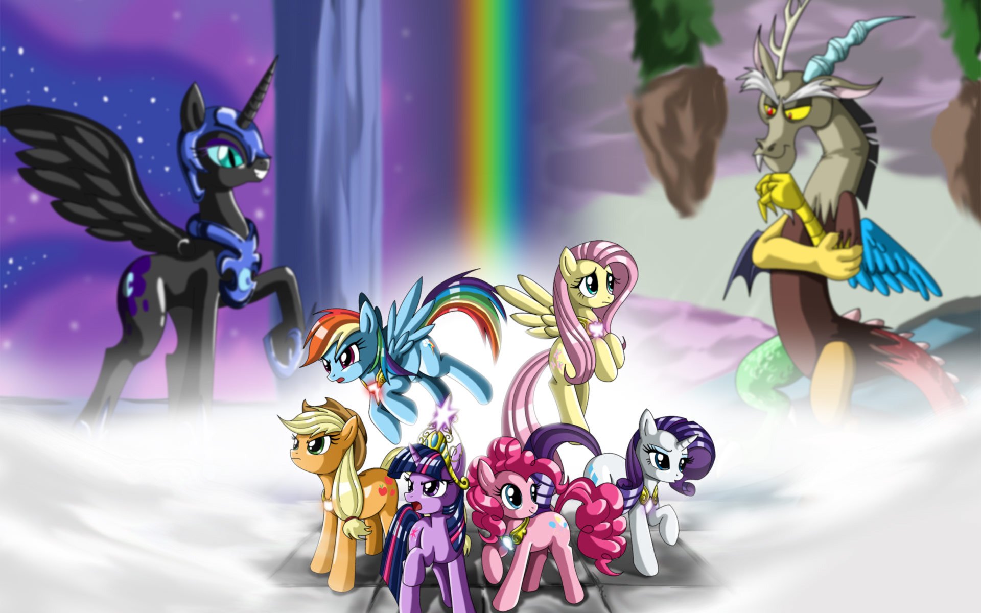 Description: A group of pony standing next to each other on a snow covered ground with a rainbow in the background.