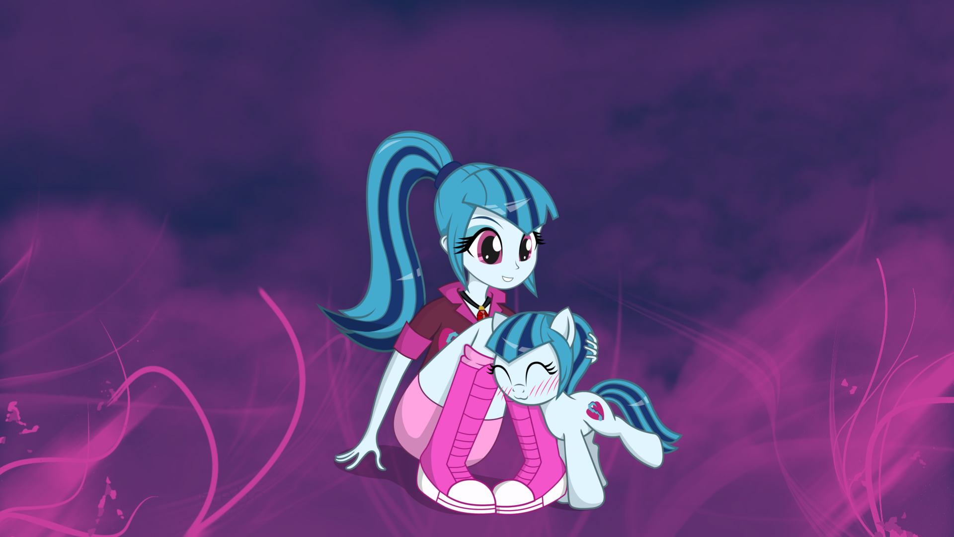 Description: A pony and a cat sitting on top of each other in a purple background with swirls and clouds.
