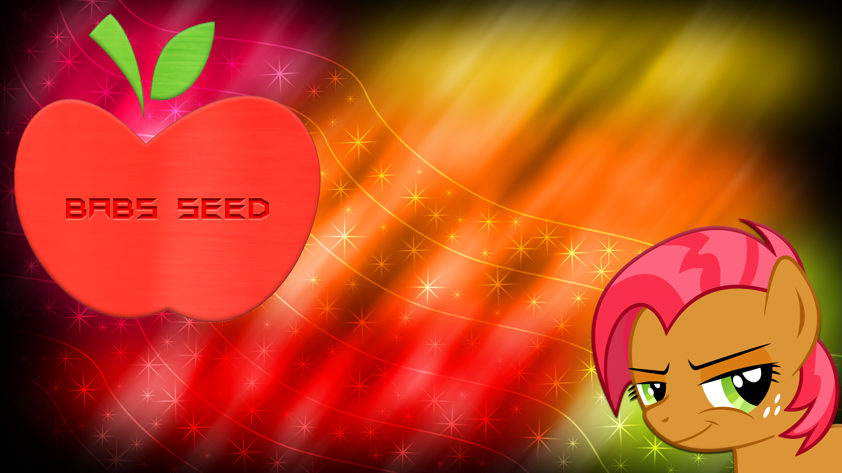 Description: A pony with a pink hair and a apple on a black background with stars and a rainbow light behind it.