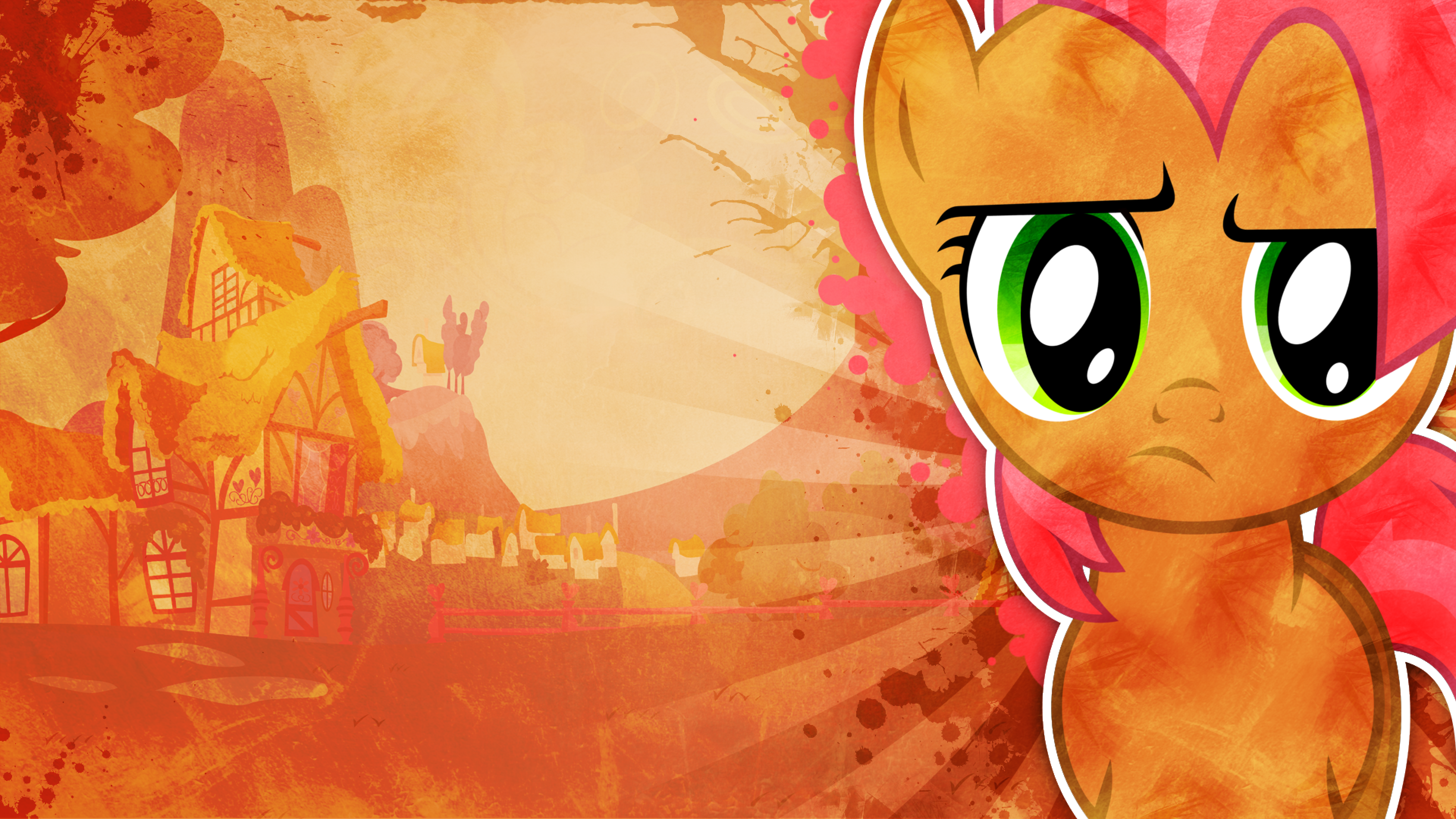 Description: A picture of a pony with a pink hair and green eyes and a house in the background with a splottered background.