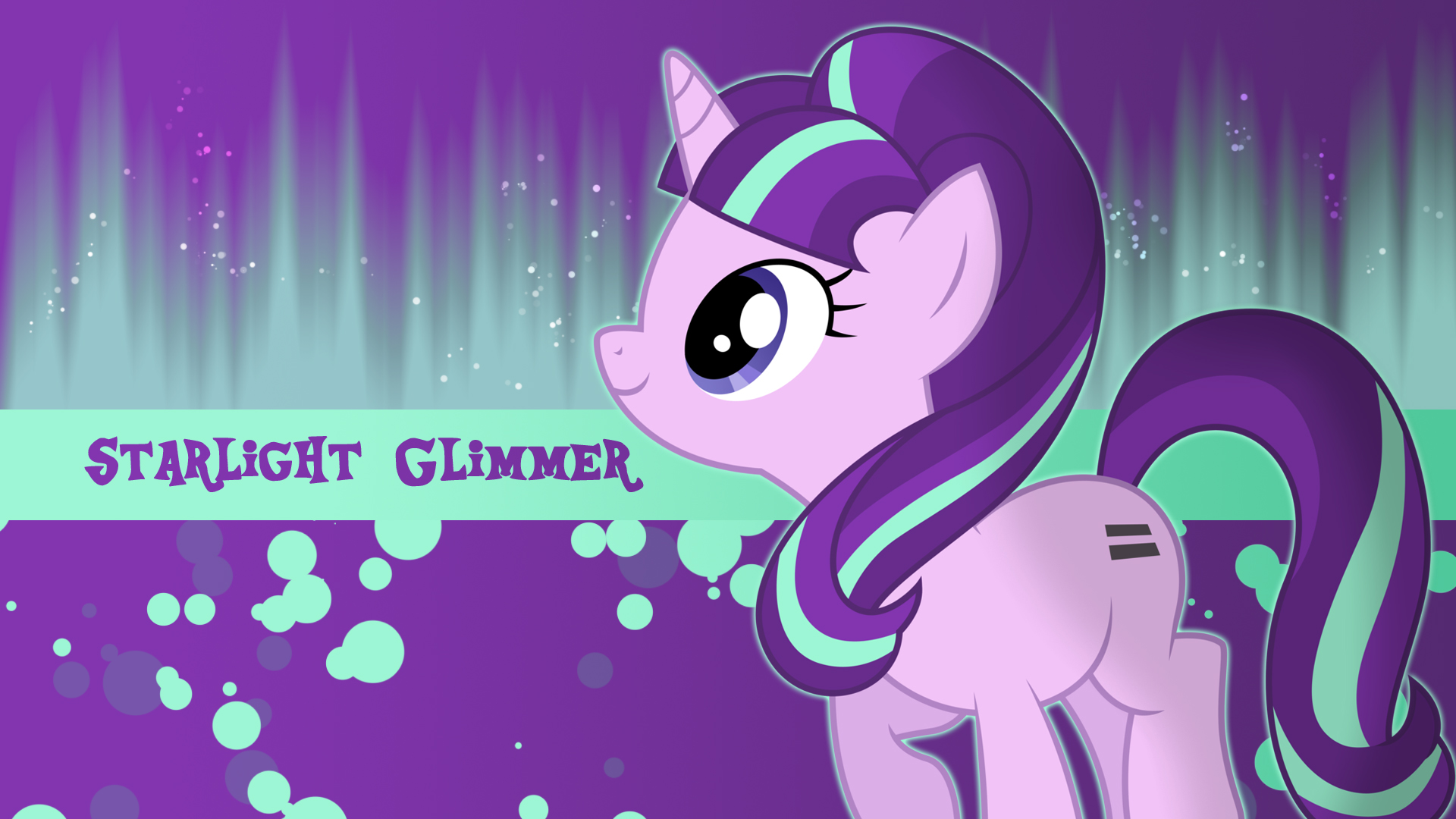 Description: A pony with a purple mane and a blue tail and a starlight glider on its head and a purple background.