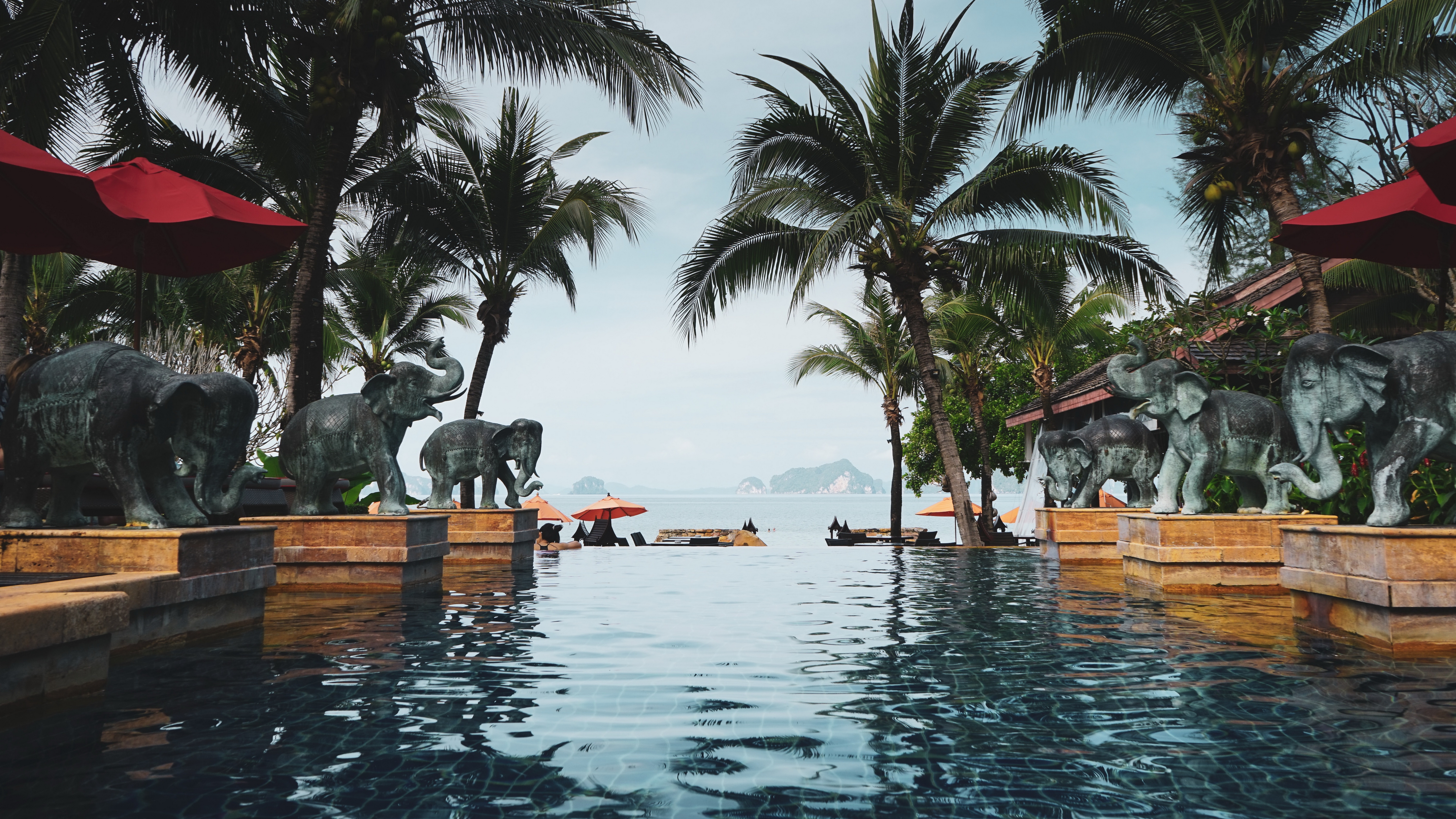 Description: A pool with statues of elephants and people in it and palm trees surrounding it and a beach in the distance.