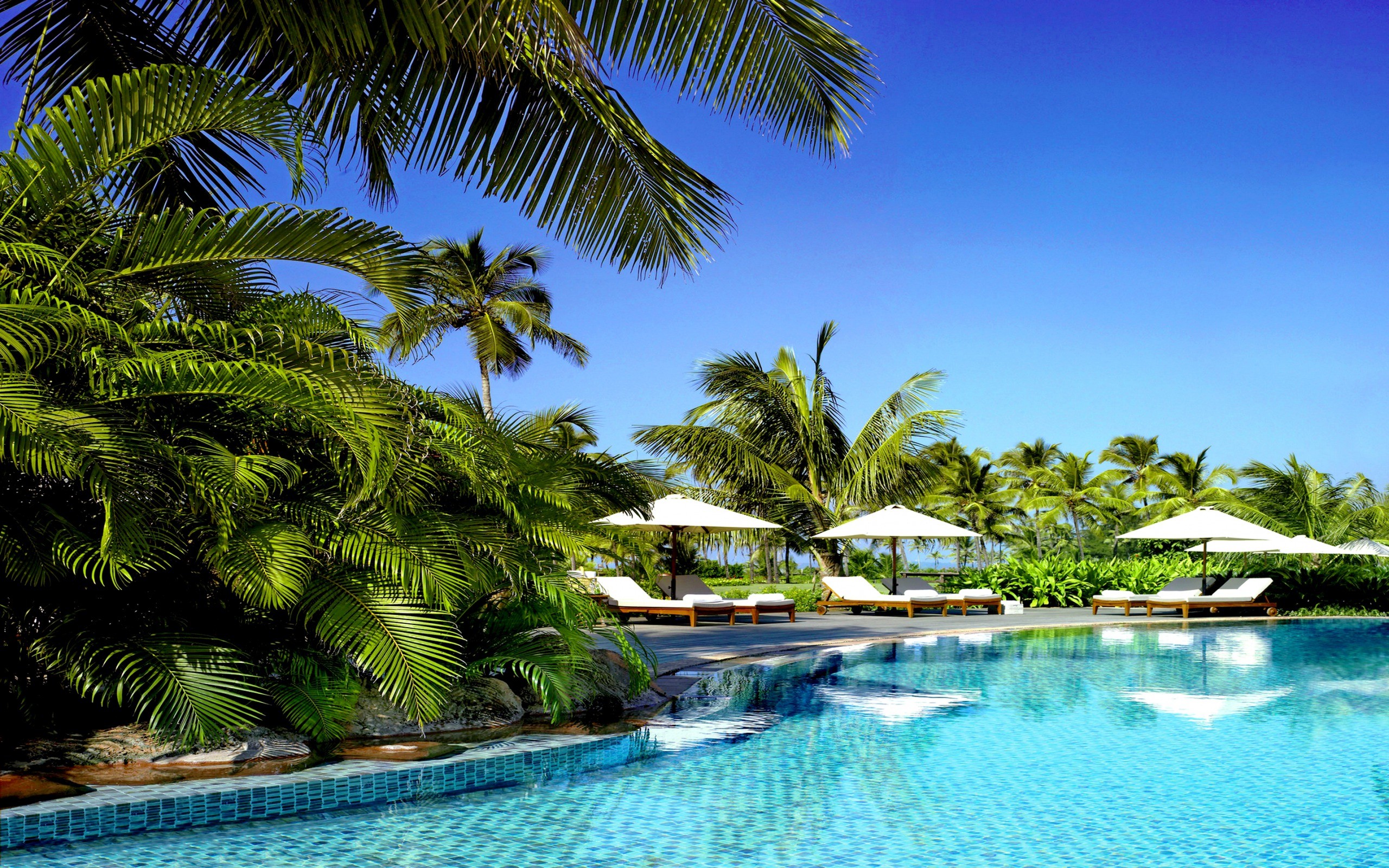 Description: A pool with lounge chairs and umbrellas next to it and palm trees in the background with blue sky.