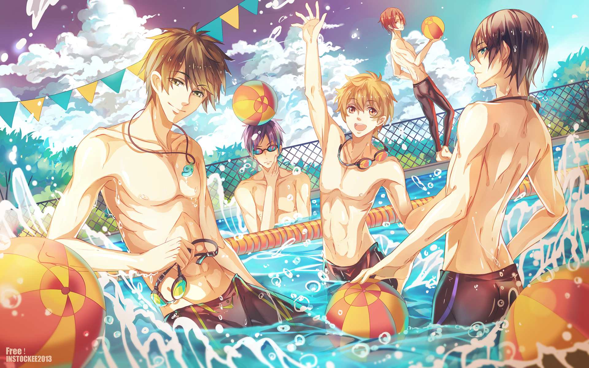 Description: A group of people in a pool with a ball in the air and a netted net in the background.