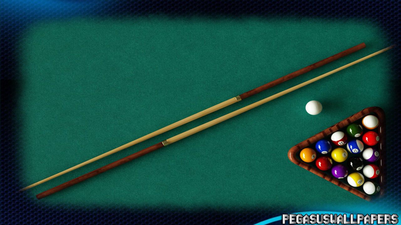 Description: A pool table with a pool cue and pool balls on it and a pool cue in the middle of the pool.